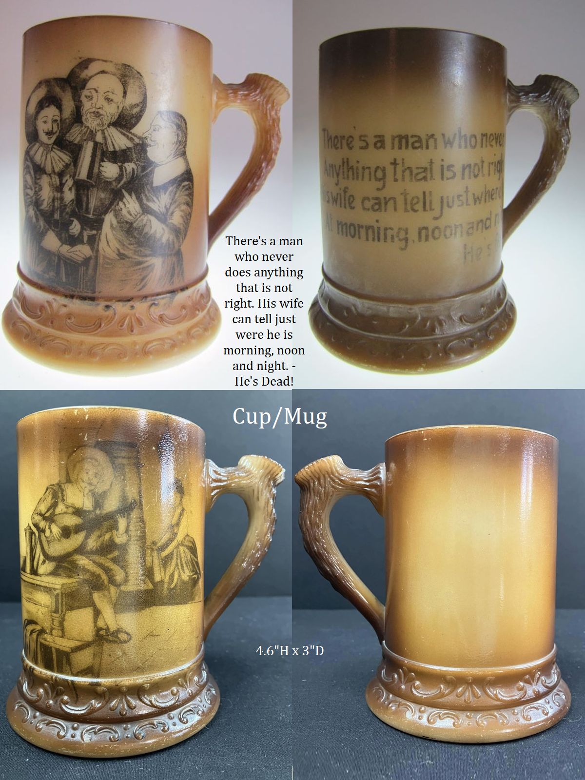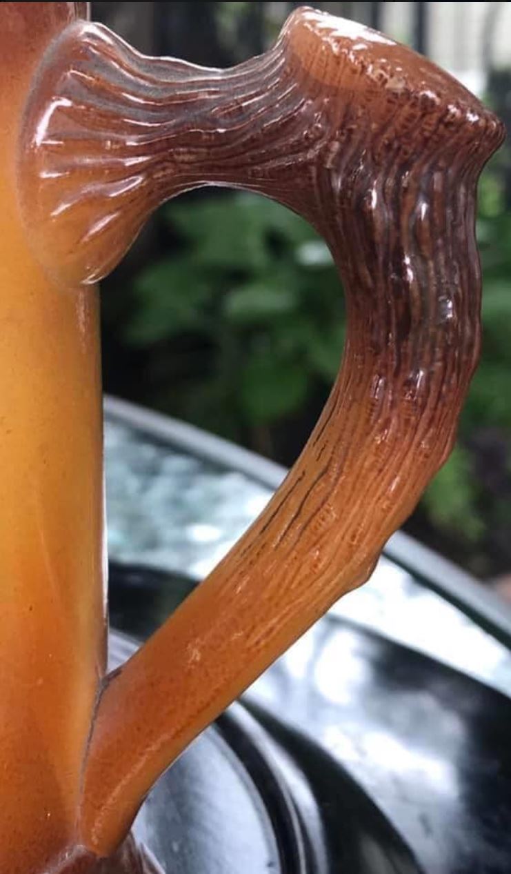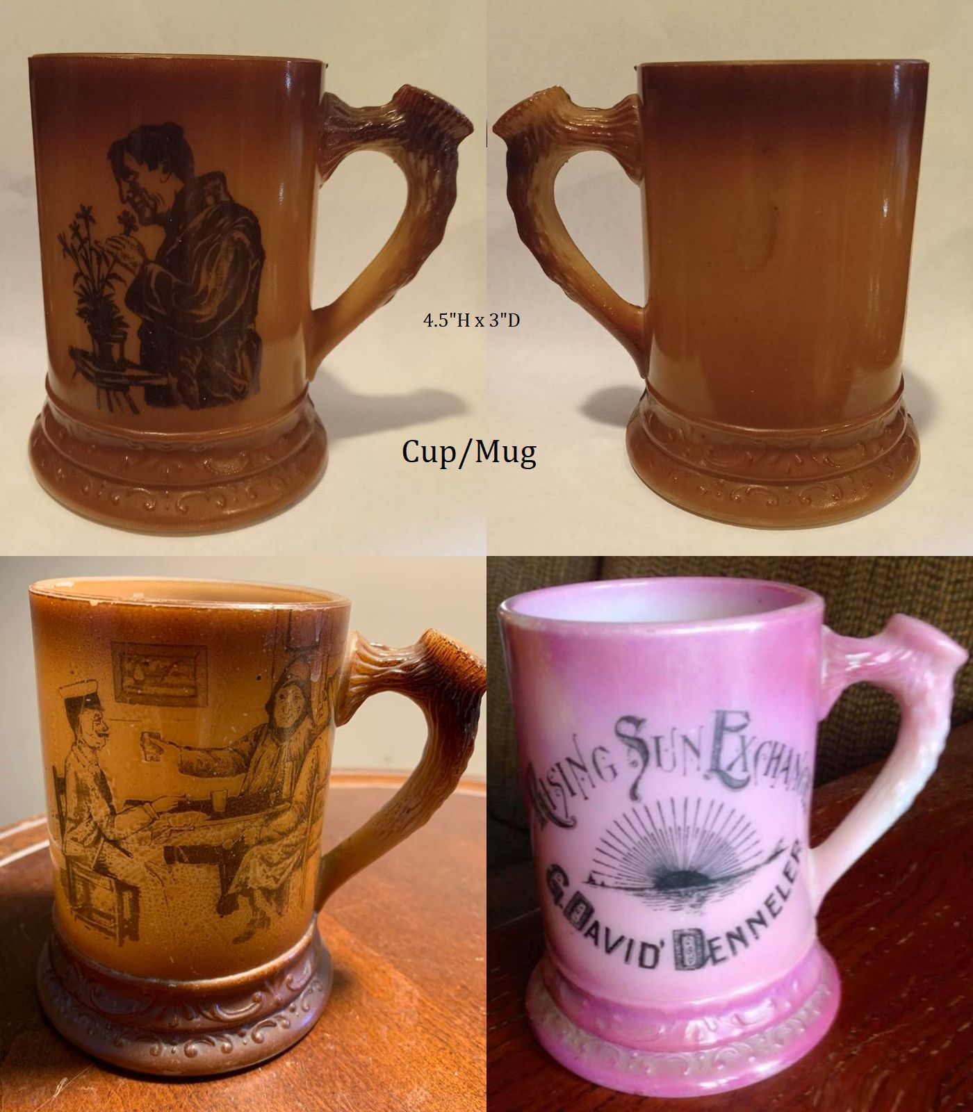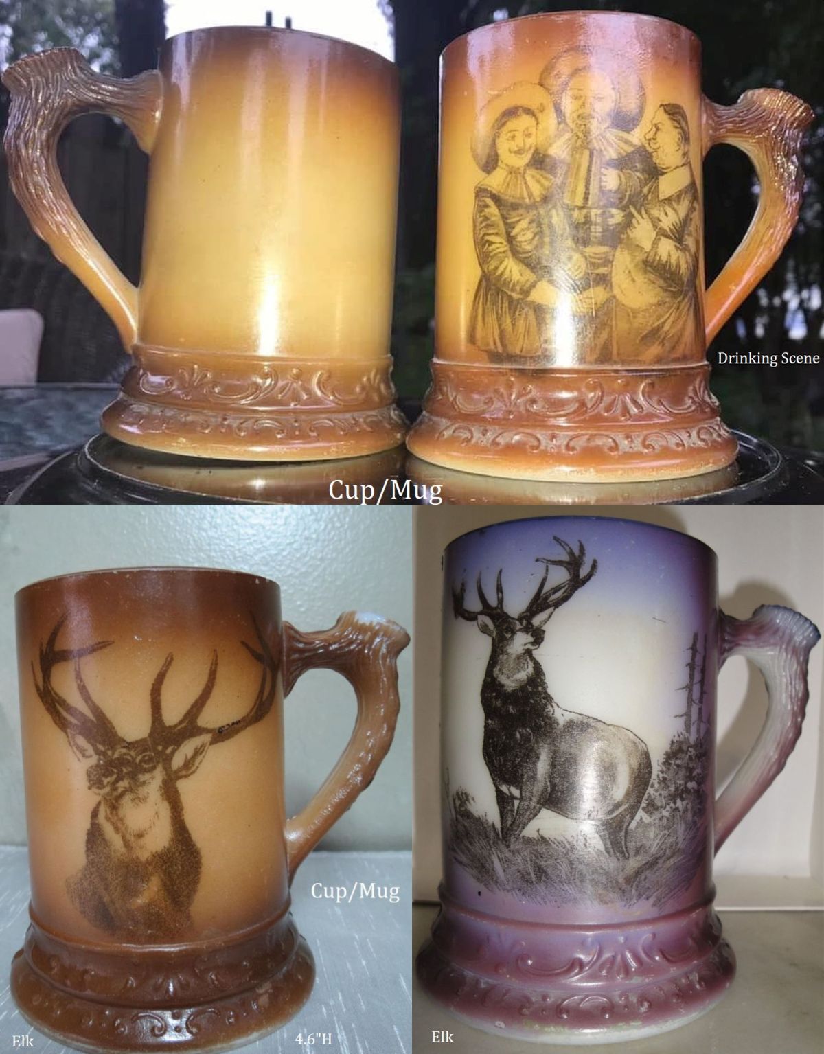 NOTE 2020: handles are molded into antler-effect grain. Sets came with a matching tankard pitcher.