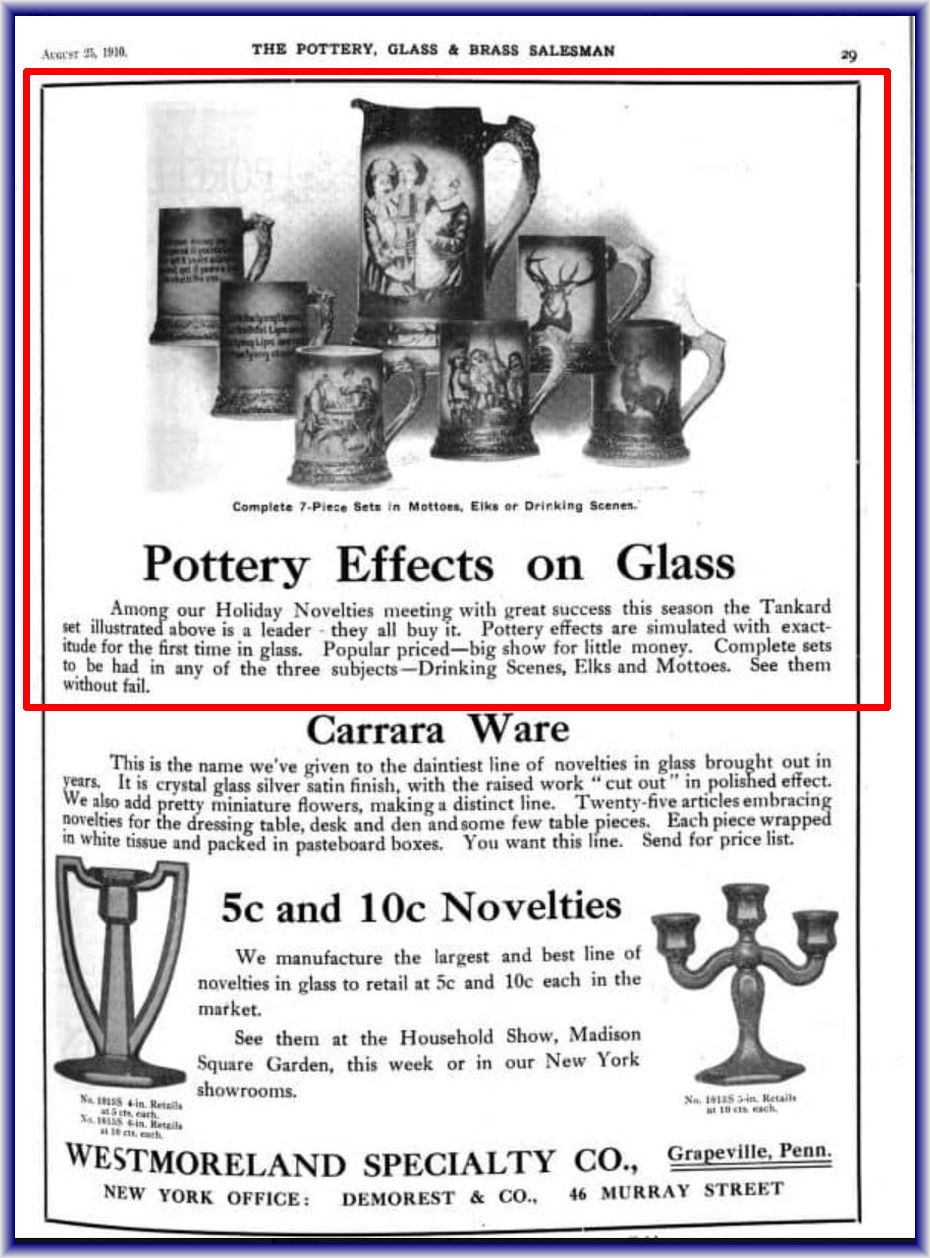 POTTERY EFFECTS TANKARD SET (AKA) wsc by Westmoreland Specialty Company/Grapeville-PA (Company Operated: 1889-1924), c1910 Introduced
