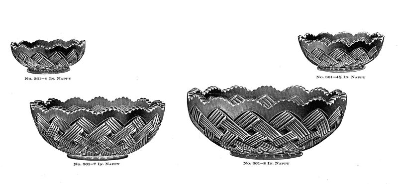 NOTE: Sid Eapg (Lethbridge) 2024: No. 361 aka Criss Cross (OMN) nappies. The cut is from a c1909 Heisey catalogue. These bowls were also spun out after pressing to make plates.