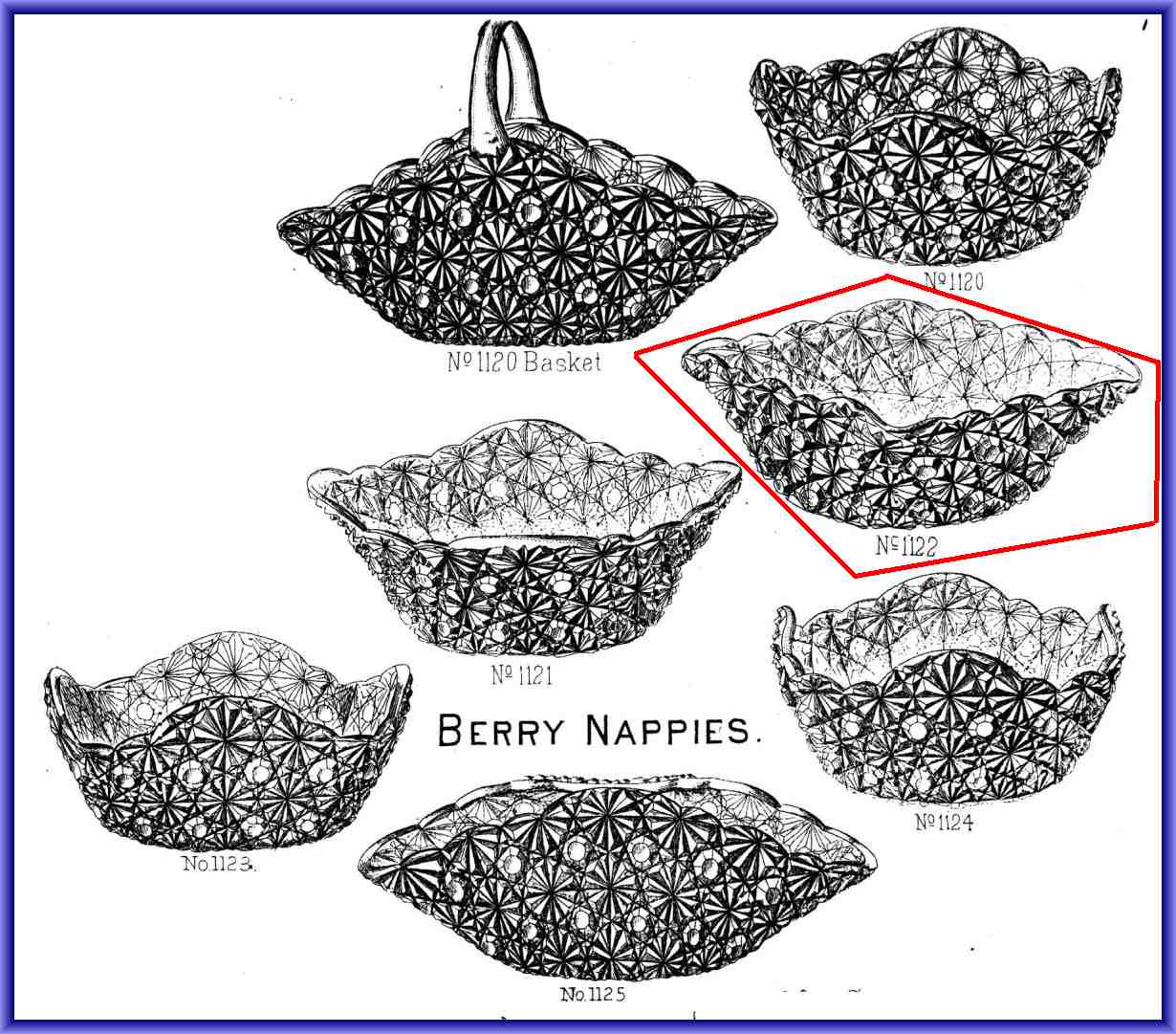 NOTE: Sid Lethbridge - They took their No. 1120 small berry bowl (they called it a berry nappy) and, after pressing, hand worked it to various shapes including a handled basket. The form had numbers ranging from 1120 to 1125.