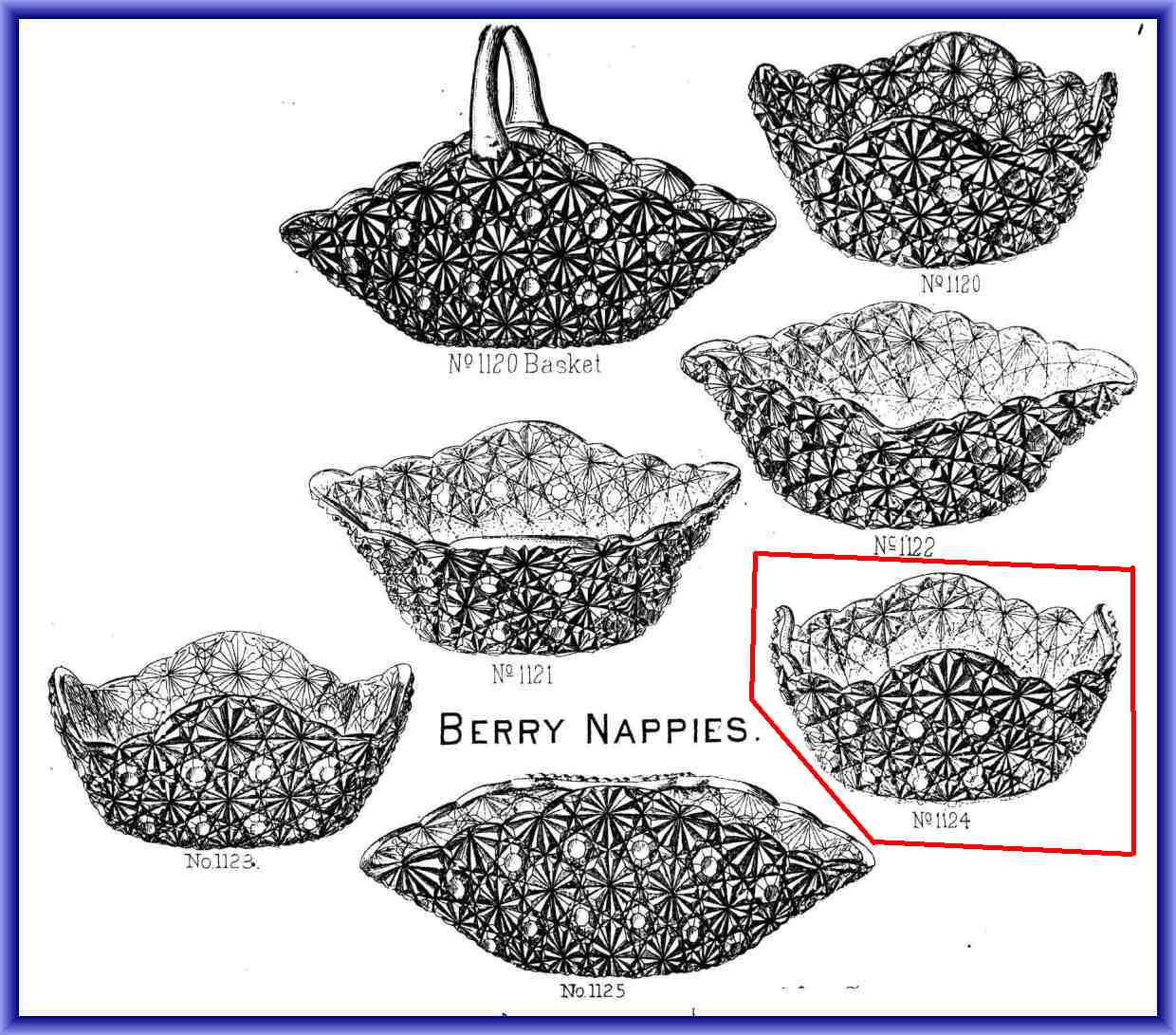 NOTE: Sid Lethbridge - They took their No. 1120 small berry bowl (they called it a berry nappy) and, after pressing, hand worked it to various shapes including a handled basket. The form had numbers ranging from 1120 to 1125.