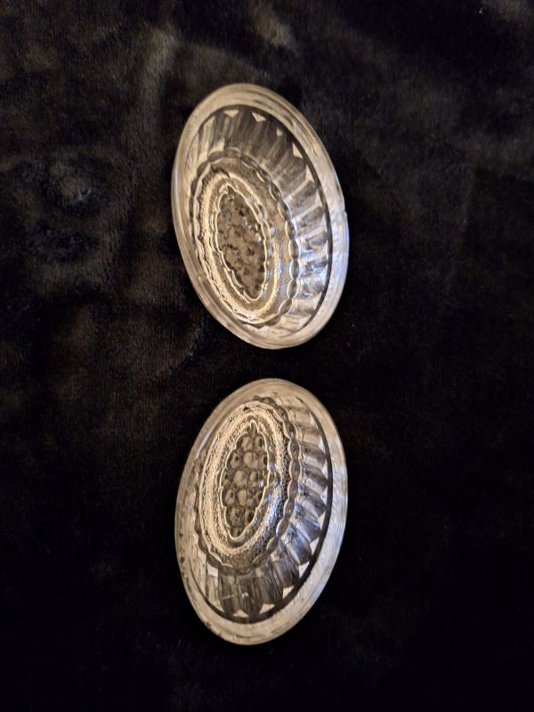 Contributor: Pat Clark jelly mould 3 1/8" at widest, 1 3/4" height. There is a grape design in the bottom, and the below impressed: PATENT JULY 6TH 1897