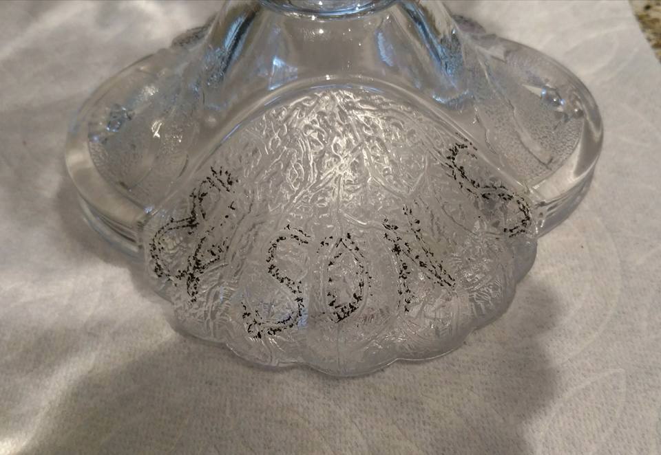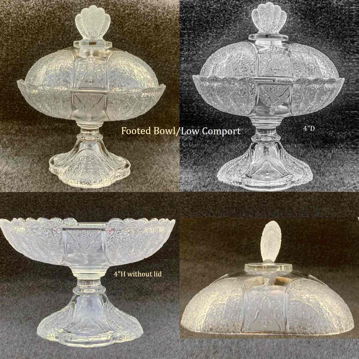 Contributor: ChrisandGina Dotson Approx 9” H with lid, 5.5” without Interior 4” W, 4” deep Foot is 3.5” W 3” from foot to base of bowl