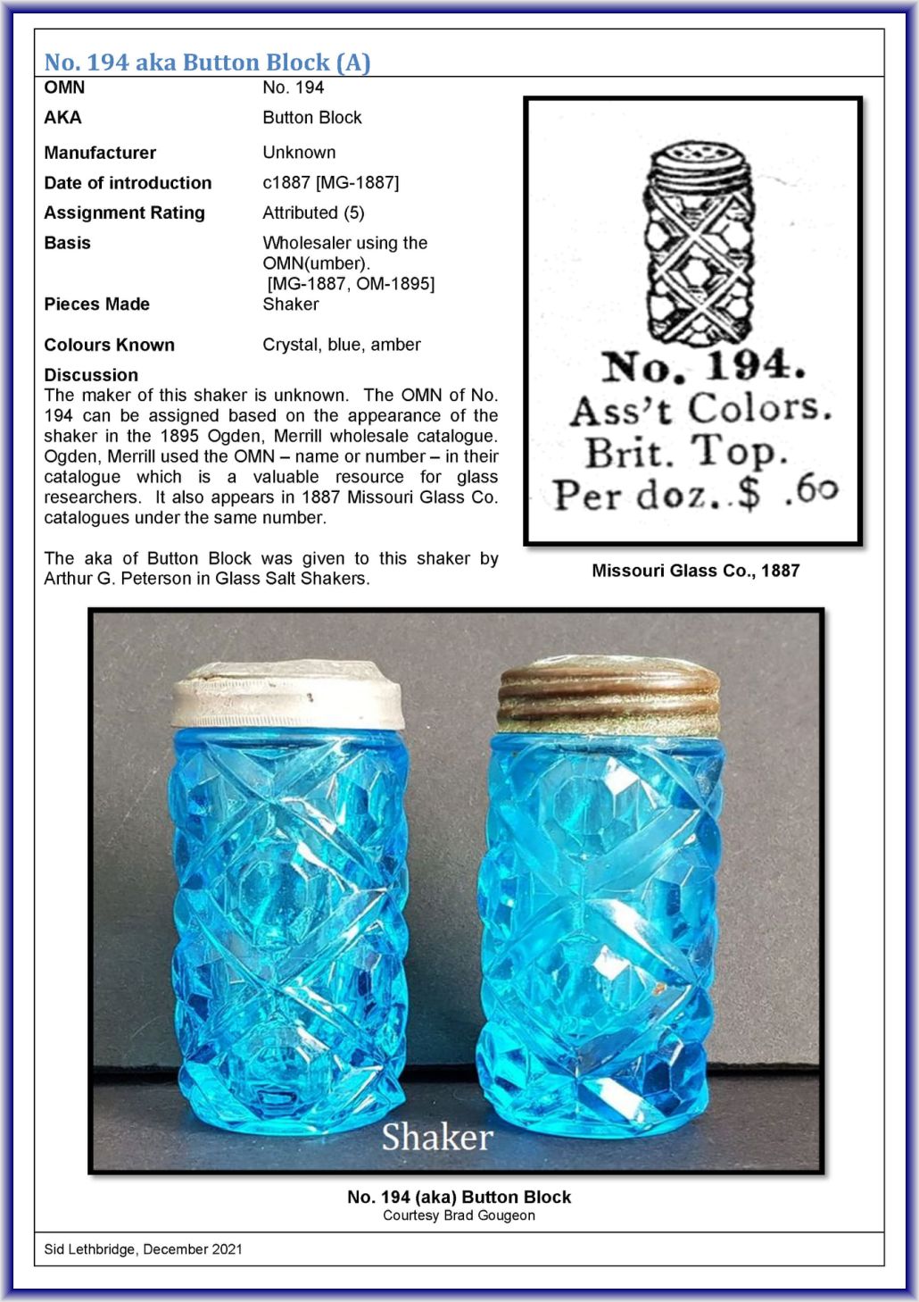 UNKNOWN GLASS COMPANY PATTERN No. 194 (OMN) by Unknown Maker/Unknown Location (Company Operated: Unknown), c1887 Introduced