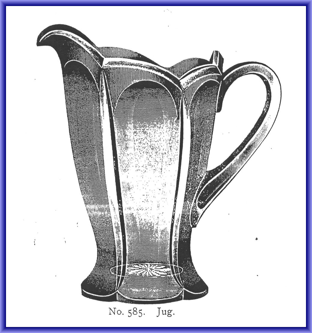 NOTE: The only item shown in the catalogue is a pitcher. This line undoubtedly originated at the Riverside Glass Co. c1905. Continued by Tygart Valley Glass Co. c1908