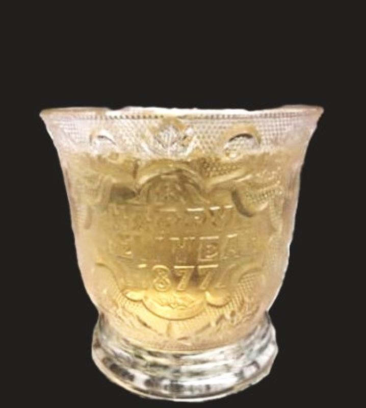 Contributor: Pam Ann 3 1/4 inches tall and 3 1/4 inches wide Motto reads "Happy New Year 1877"