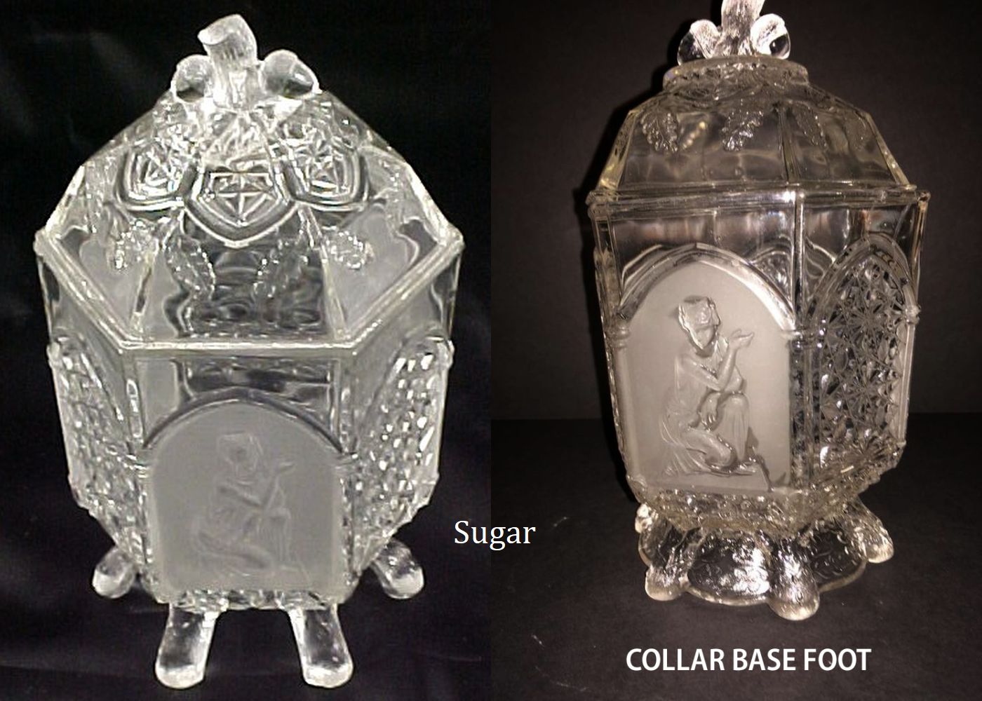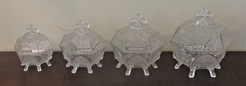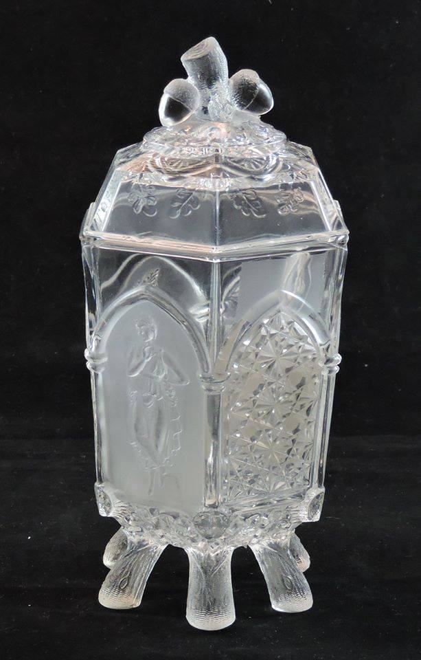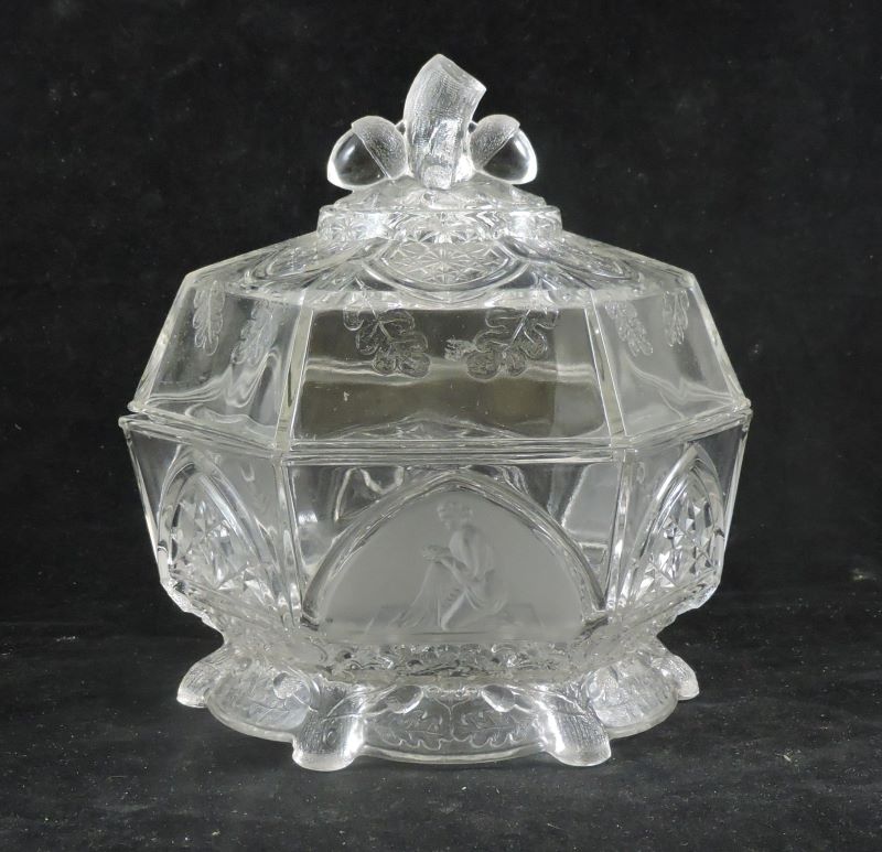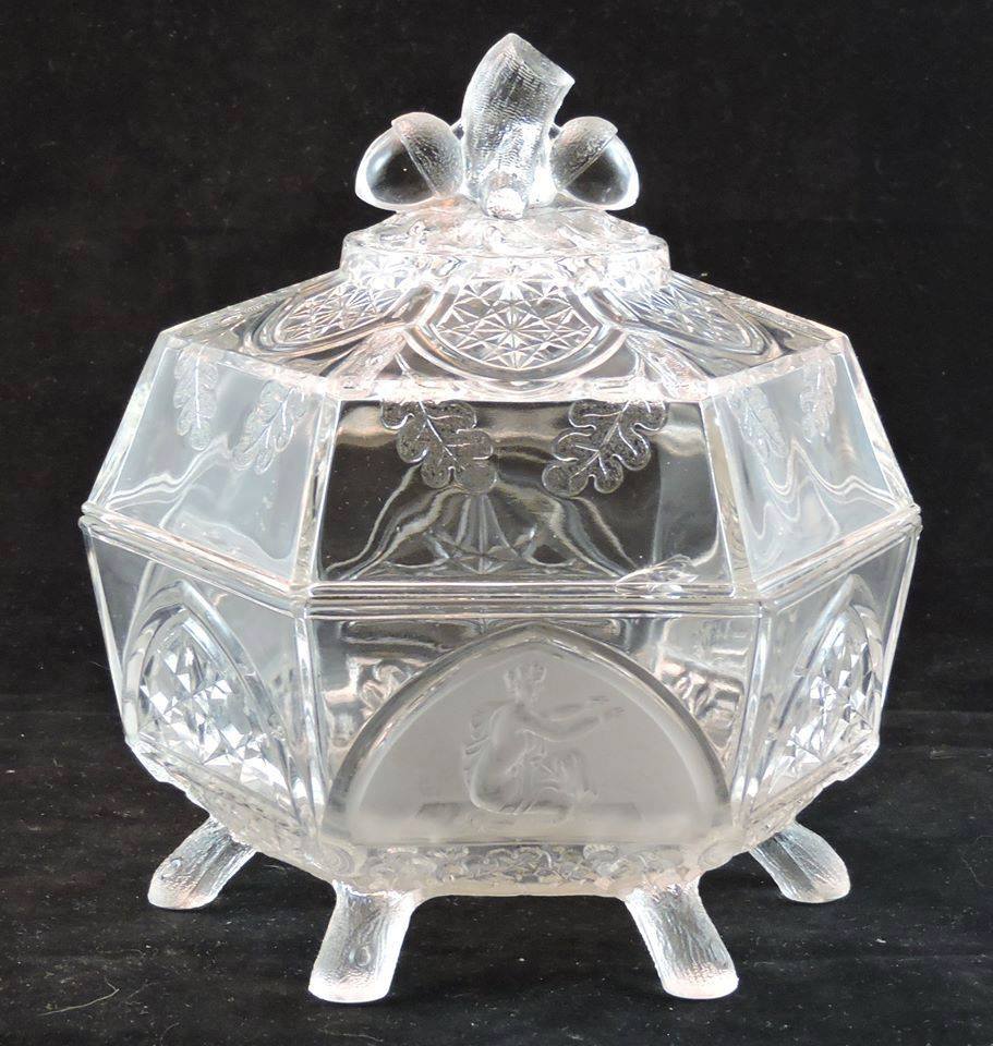 Contributor: William Freyholtz - 8D covered comport - 9.38H, cover including finial 5.18H. Bowl 4.18H. Inside bowl measurements, flat side to side 7.38W, point to point 8.38W.