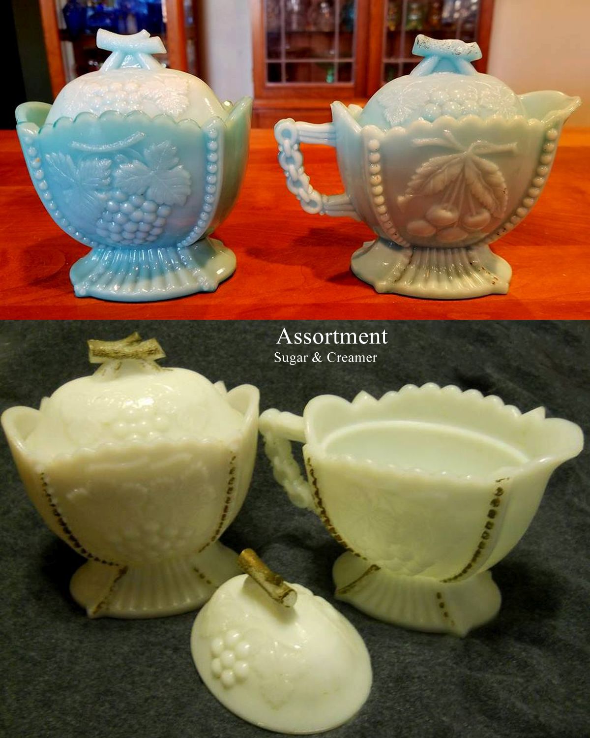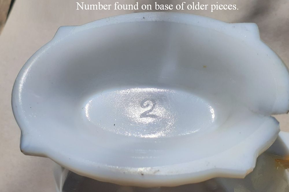 Some of the older ones will have a simple number in the bottom of the mould. Later they marked these with the familiar WG mark. I would say your (Brenda B Joens) blue ones are in the 1910 range since the later blue milk is much different looking in color and not as pale.