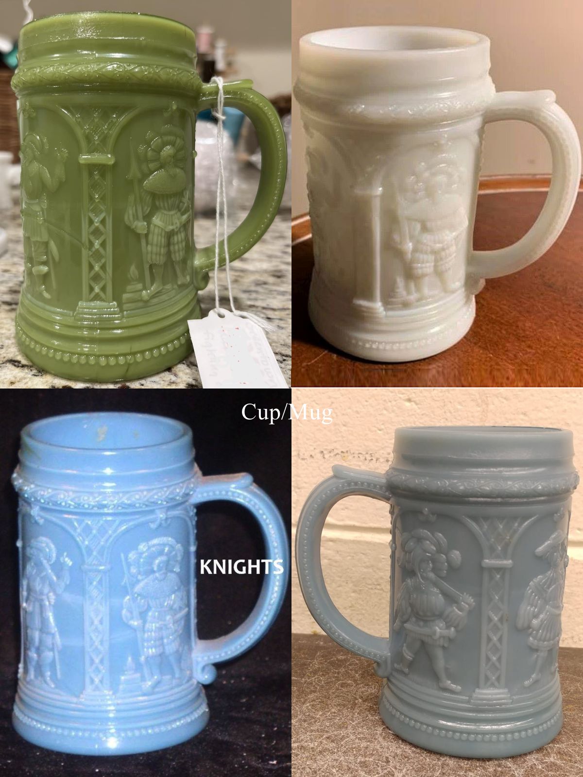 Roger Haworth: The three Westmoreland mugs (Elves, Knights, Troubadour) were originally issued in milk white, opaque blue, opaque green, rarely in clear. Westoreland reissued in the 1980's in non-original colors. The handles on ELves and Knights are the same, different on Troubadour ( the same as McKee's Serenade)