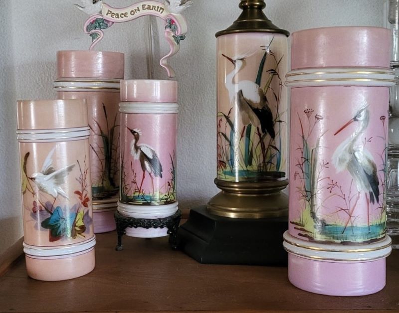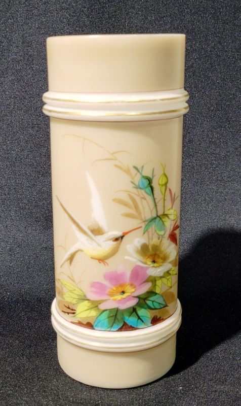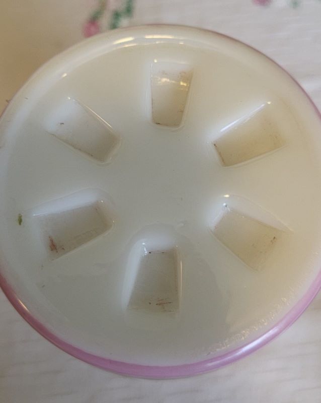 NOTE: Hawk Jackson 2023 - Made by B&S (page 59 1874), Mt Washington, Samuel Bowie and Gillinder. The indentations made at Boston and Sandwich are trapezoid shape. Could be painted by Smith Brothers or shops including Edward Swann or Charles Spurr, all these decorating companies did these well past the closing of B&S. There are so many of these around that the only way to give a definitive attribution is to have irrefutable documentation. Rectangular cleats on bottom is "other" makers. Trapezoid is either Boston Sandwich or Mt Wash. Flat base is definitely B&S.