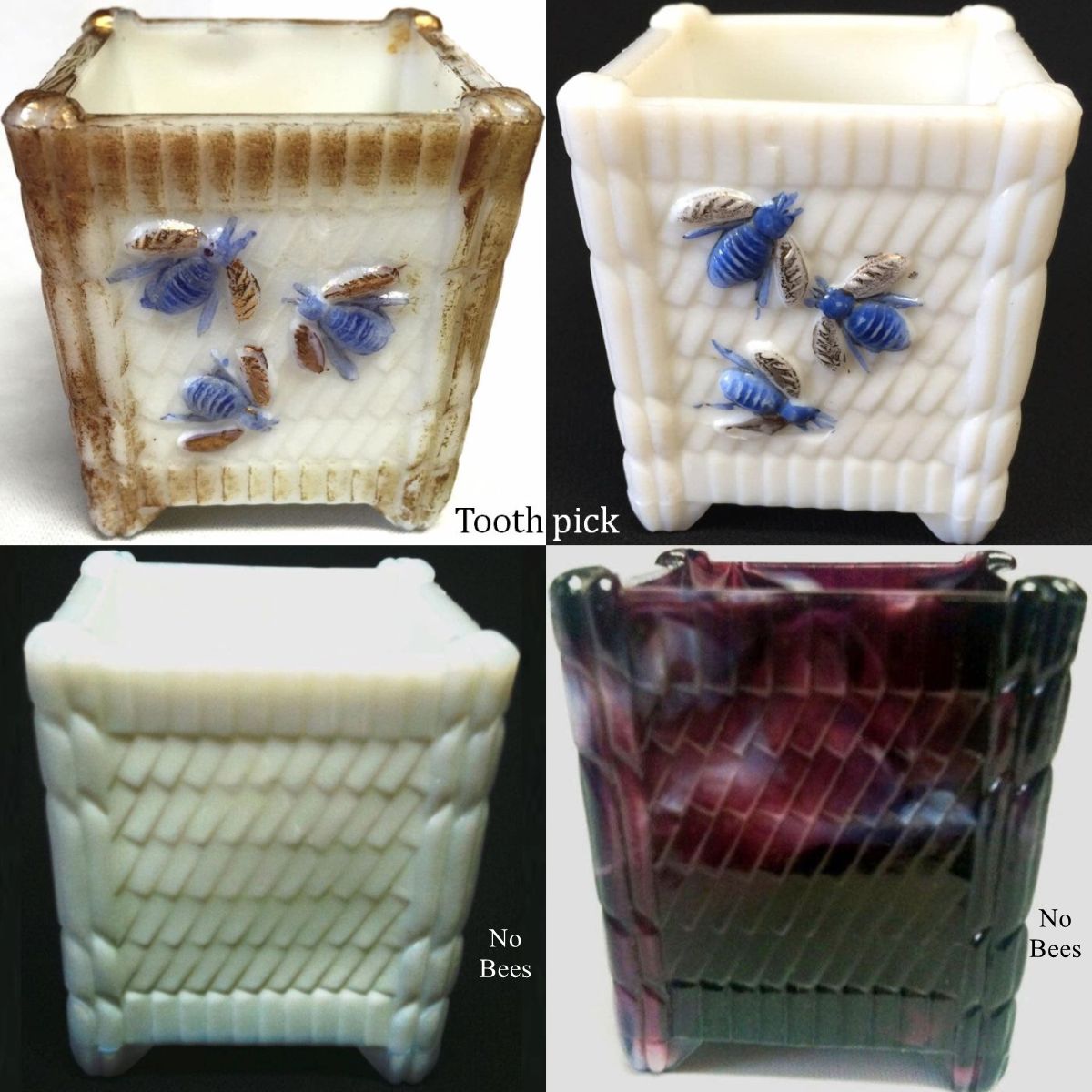 NOTE: Sid Lethbridge - The maker is unknown but we can place it to c1887 based on its appearance in a Butler Bros. catalogue of that year. They can be found in opal (milk glass), ivory (custard), opaque blue and purple slag and other colours. The ad suggests that the winged insects are flies not bees. Possible makers include Challinor, Taylor; Atterbury; or another unknown maker who was also making slag glass in the mid 1880s.
