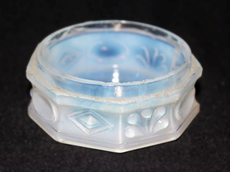 NOTE: Brady Fitts 2025 - This box (Jar) is shown in Barlow and Kaiser’s Vol. 3 “The Glass Industry in Sandwich” number 3294-b Diamond, Fleur-de-lis, and oval panel Pressed Ointment Box. It would have a metal cover. The measurements are the same as the one in the book: 1.12 inches high and 2.12 inches in diameter. The maker was either New England Glass Company or the Boston and Sandwich Glass Company. Refer to numbers 3291, 3292 (a & b), 3293 (a & b), and 3294 (a) for similar boxes.