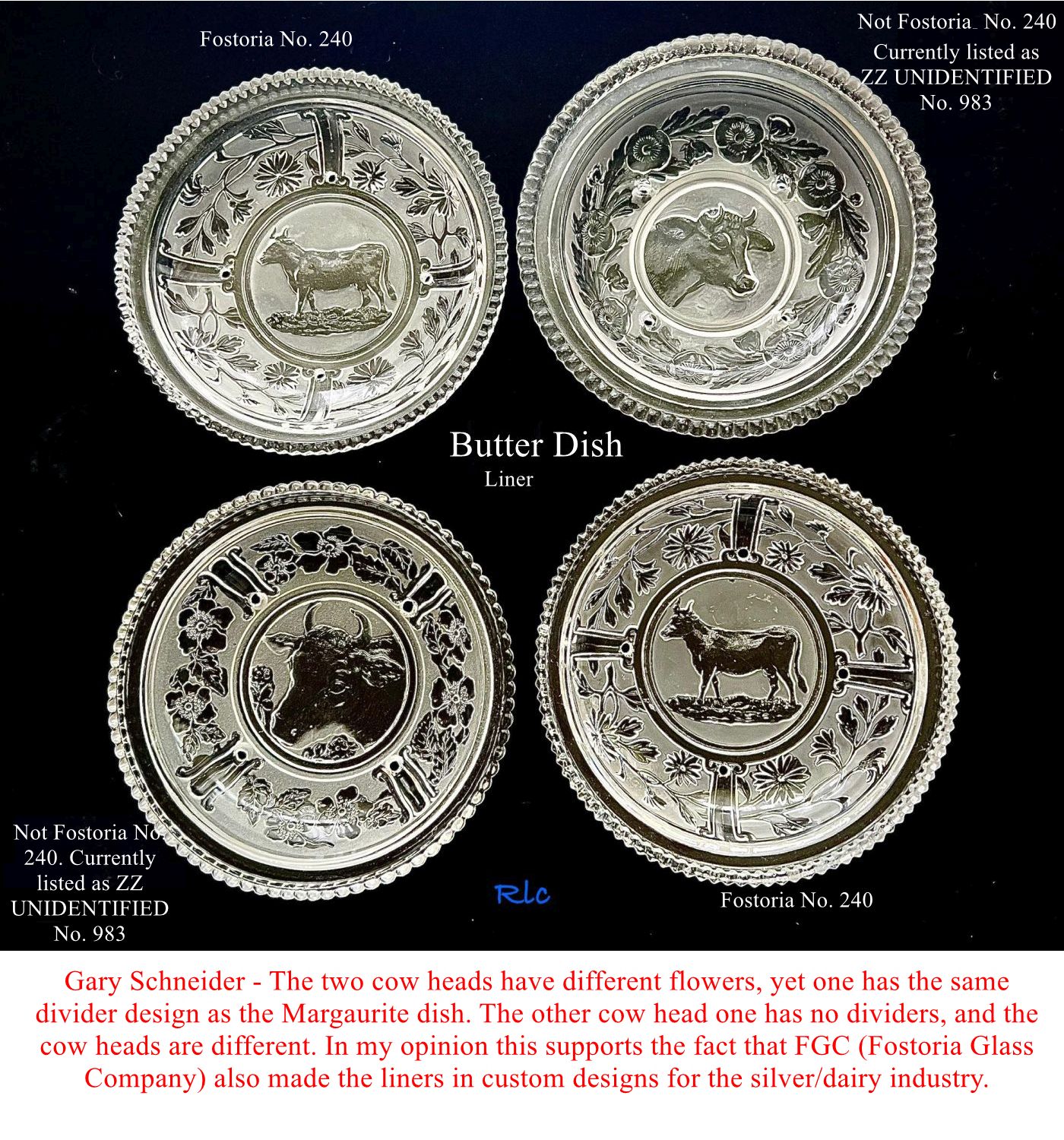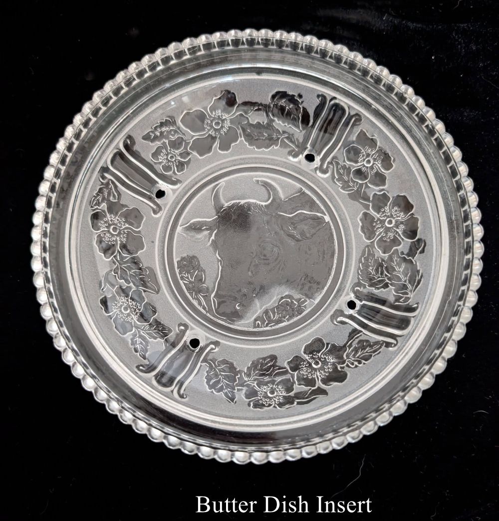 NOTE: A butter dish insert. Similar, yet different to Fostoria No. 240 Margueritte. Gary Schneider feels these were made as custom designs for the silver/dairy industry.