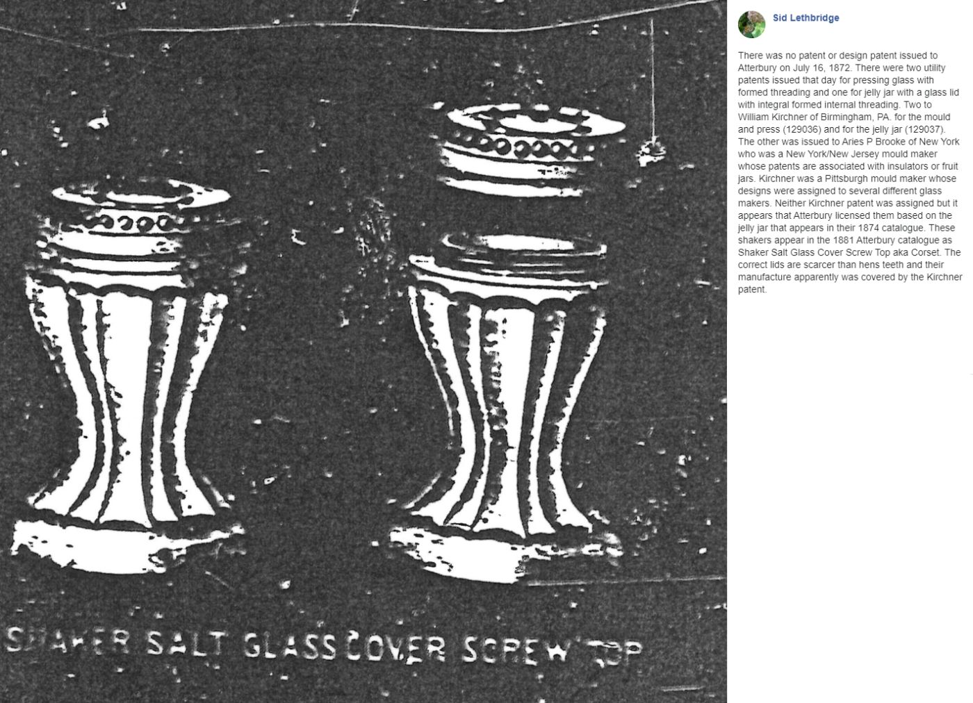 SHAKER SALT GLASS COVER SCREW TOP (OMN) by Atterbury & Company/Pittsburgh-PA (Company Operated: 1850s-1900), c.1881