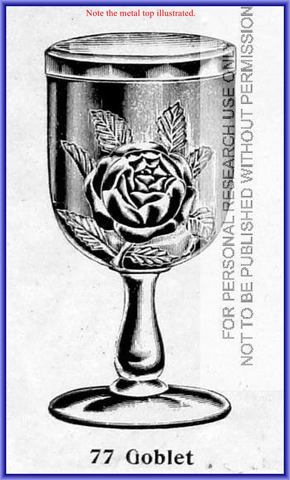 NOTE: Sid Lethbridge: (goblet) Shown in their catalog with a lid which suggests that it was sold as container ware. …. It appears that Dalzell, Gilmore and Leighton differentiated their better lines of glass ware by using a D in the number. So No. 77D is indeed a different design than their No. 77 goblet.