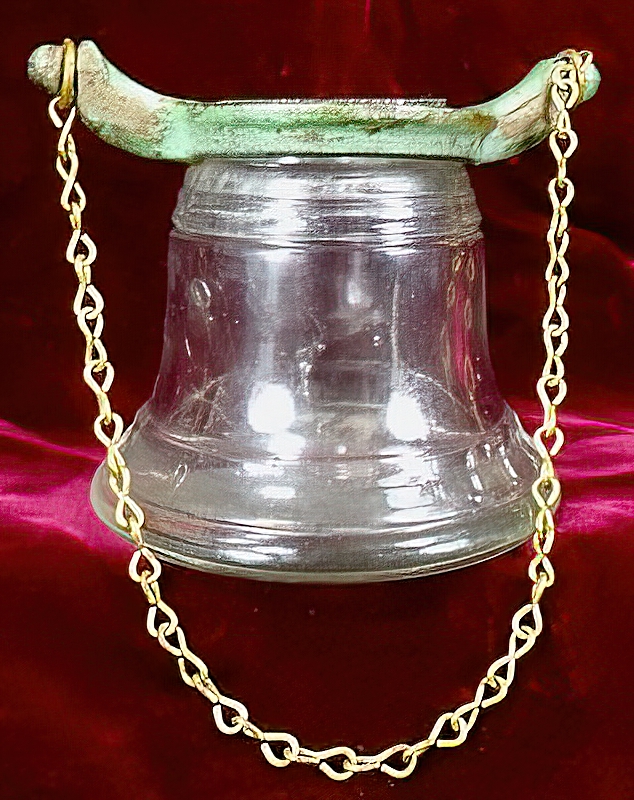 Contributor: Valerie Strunk possibly match holder.1776 and 1876 only on bell. Not marked. Base 2 5/8"D, brass piece 3 1/8"L x 1 3/4"W. Glass bell is 2 1/4"H