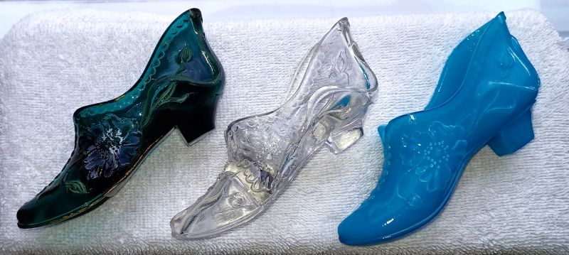 NOTE: Liz Roach 2019: ref Metz 2, pp214-215. "early 1890's" R 2019: ref Lee's Victorian Glassp473 and Plate 199. She describes a "slipper" "light blue opaque with a poppy decoration in relief...gilded...The same slipper may be found in milk-white with gold decoration and in amber, slightly opalescent, almost like the so-called "Caramel", of which so many were made in Indiana." A opaque shoe can be seen in a poor group photo, plate 199.