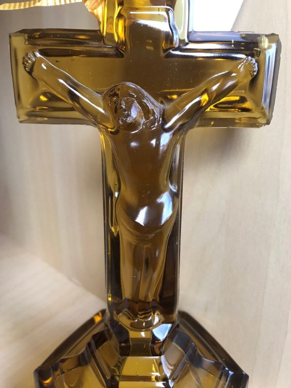 NOTE: Teresa Haas 1-11-26 - These C/S's are described in "The Candlestick Book, Volume 3" (Felt & Stoer, p. 325, AP-HO1a & HO1-b), by unknown maker. The authors also stated: "Because of the differences in detail and glass quality, we suspect that this mold passed from one company to another." No date is given, but the details of the early version are similar to other crucifix candlesticks dating to the last quarter of the 19th century,...Mine are crystal, milk glass, 2 shades of amber, and blue. I believe the mold, modified in a way to obscure the inscription after the (IRNI) error was noticed, was just worn down because the detail in the early ones is much crisper than the late ones.