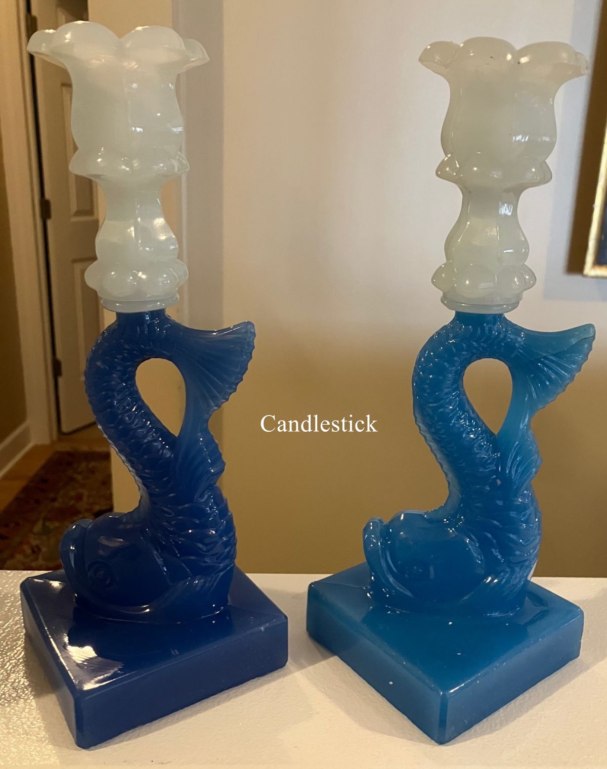 DOLPHIN CANDLESTICK WITH SQUARE BASE (AKA) by Boston and Sandwich Glass Company/Sandwich-MA (Company Operated: 1825-1887), c1855-1870 Introduced