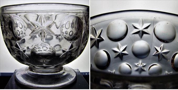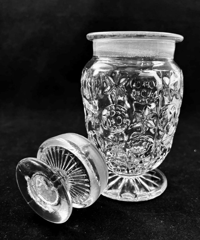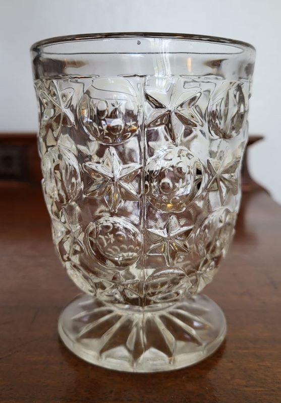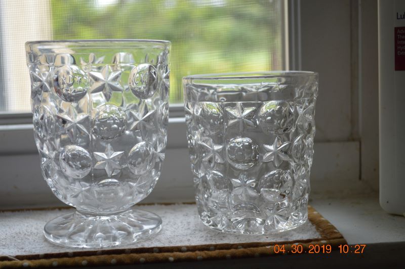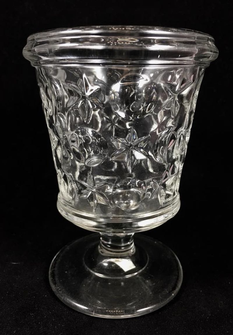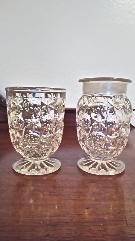Contributor: Hawk Jackson tumbler on left, pomade jar made from same mould right. Tumbler 4-1/2" tall foot 2-5/8" across top 3-1/8" Pomade 5" tall Foot 2-5/8" across Top 2-7/8" across the rim 2-1/8" open
