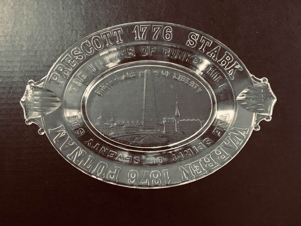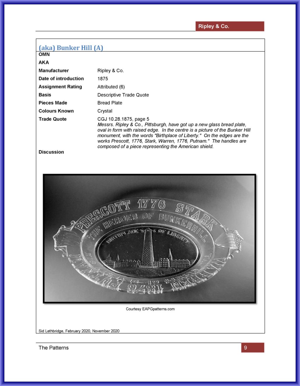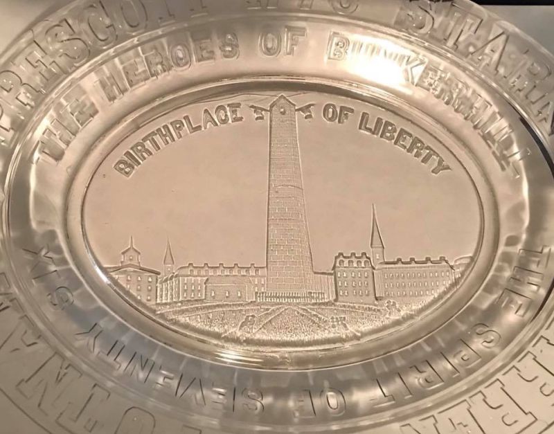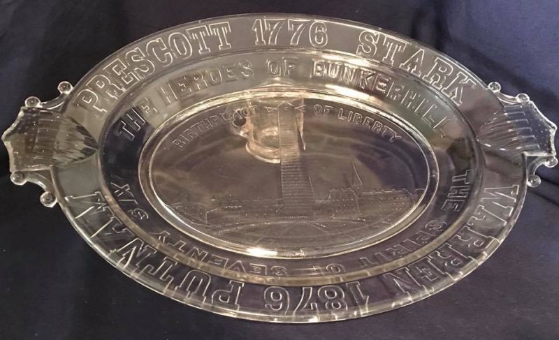 introduced in October 1875. A lot of the souvenirs of the Centennial came out in 1875. It is well described in the following quote from the Crockery & Glass Journal issue of Oct. 28, 1875 - "Messrs. Ripley & Co., Pittsburgh, have got up a new glass bread plate, oval in form with raised edge. In the centre is a picture of the Bunker Hill monument, with the words "Birthplace of Liberty." On the edges are the works Prescott, 1776, Stark, Warren, 1776, Putnam." The handles are composed of a piece representing the American shield.-- Sid Lethbridge 2018