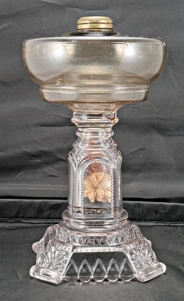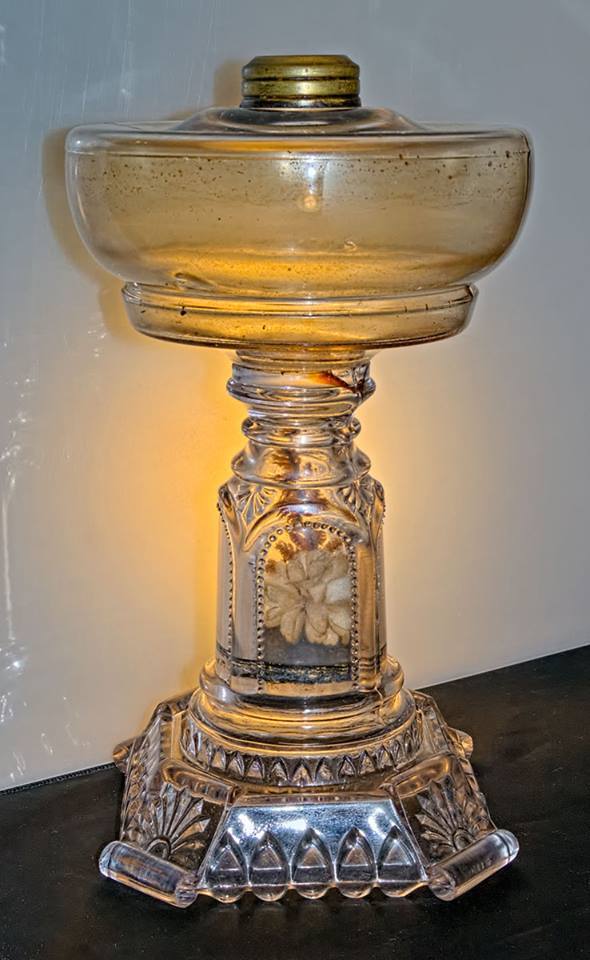NOTE: Dwight Jones: It (oil lamp) includes the original internal stem ornamentation as Patented by Samuel G. Vogeley and Adolphus A. Adams, US Patent # 261,644, July 25, 1882