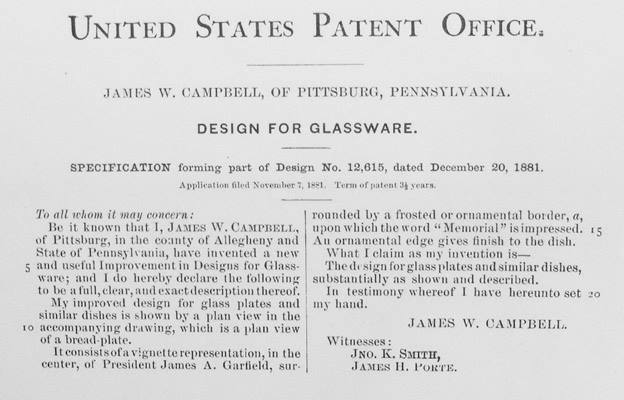 NOTE: Campbell, Jones used the same design for memorial plates for Garfield, Philip Sheridan and U.S.Grant. NOTE: Ref: Campbell, Jones & Co.: The Tableware Products of a 19th Century Pittsburgh Glass Maker by Sid Lethbridge