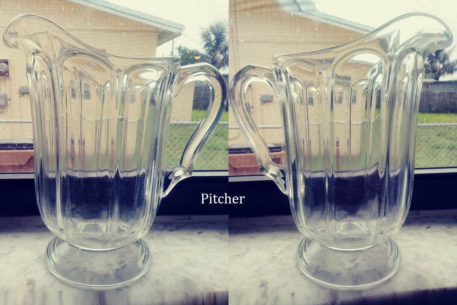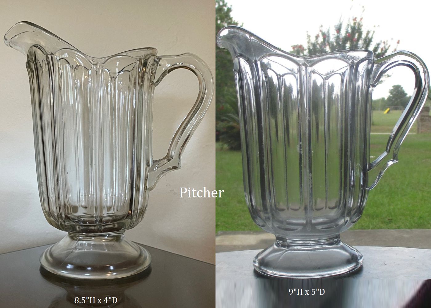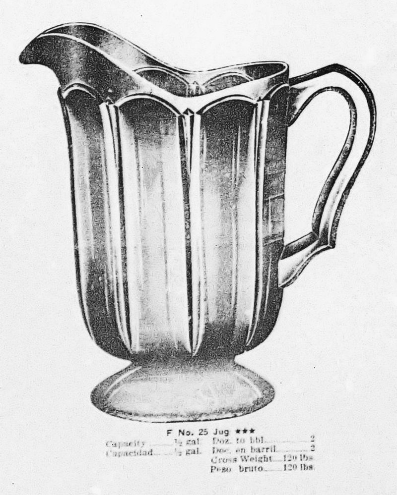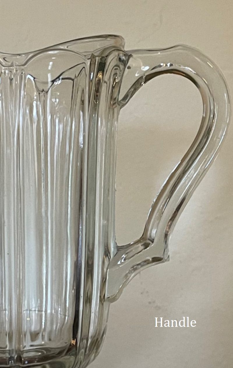 NOTE: Sid Lethbridge - This pitcher appears in a 1919 US Glass Co. catalog as their No. 25 pitcher. The pitcher originated at O'Hara Glass but with a much more ornate handle and appeared in US Glass catalogs for years. Sometime in the late 1910s US Glass modified the handle.