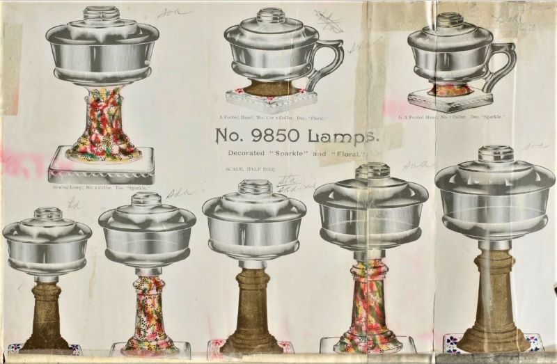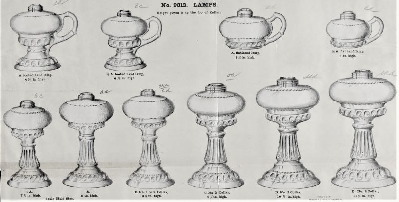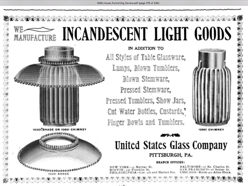 Contributor: Sid Lethbridge - Butler Bros. assortments from 1902. US Glass Nos. 9863 and 9871 appear in the "Table Lamp" (bottom) assortment with an aka Erin Fan lamp
