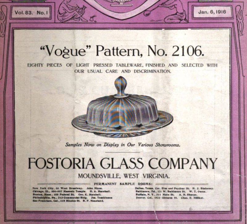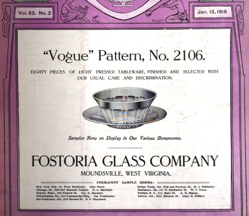 FOSTORIA GLASS CO. No. 2106 VOGUE (OMN) by Fostoria Glass Company/Fostoria-Ohio/Moundsville-WV (Co. Operated: 1887-1986), 1916 Introduced