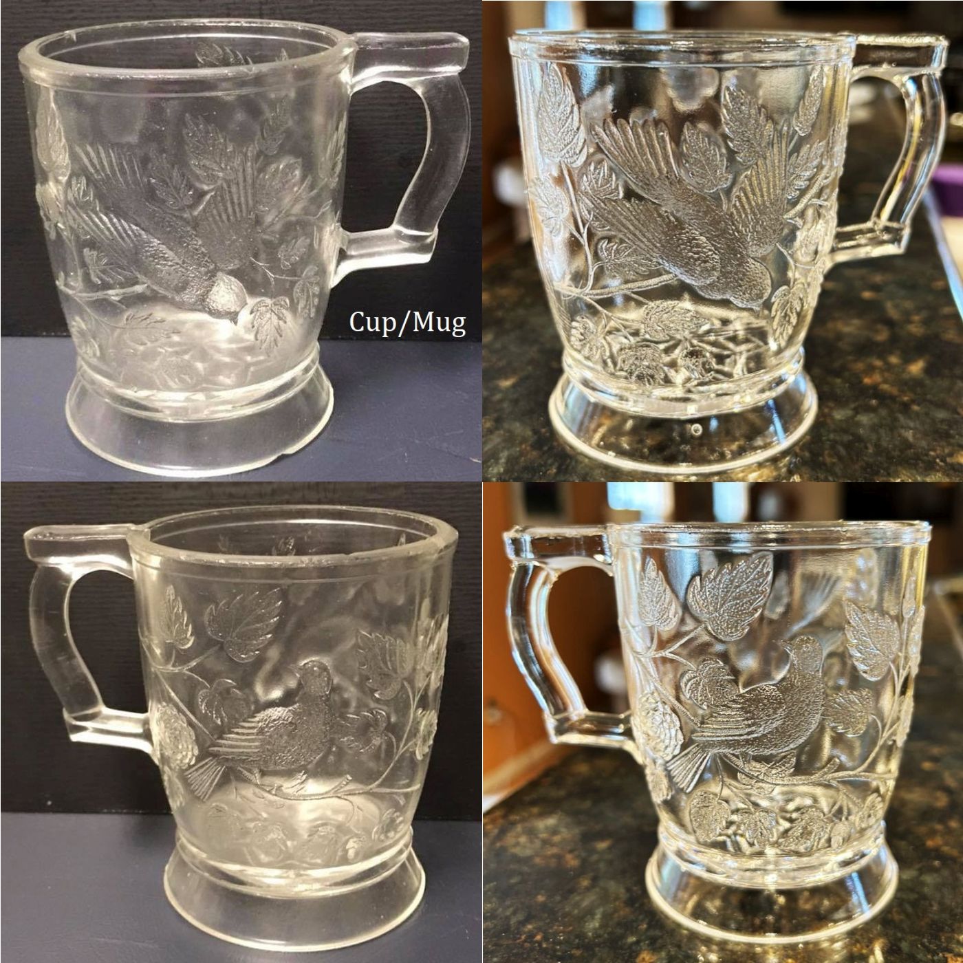 NOTE: C Eric Funston - Bryce Bros. "Robin in a Tree" - part of a graduated set including "Robin in a Tree", "Feeding Deer & Dog", "Grape Bunch", and "Pugs & Chicks". "Strawberry & Pear" has same handle and bowl shape, but is not considered part of the set.