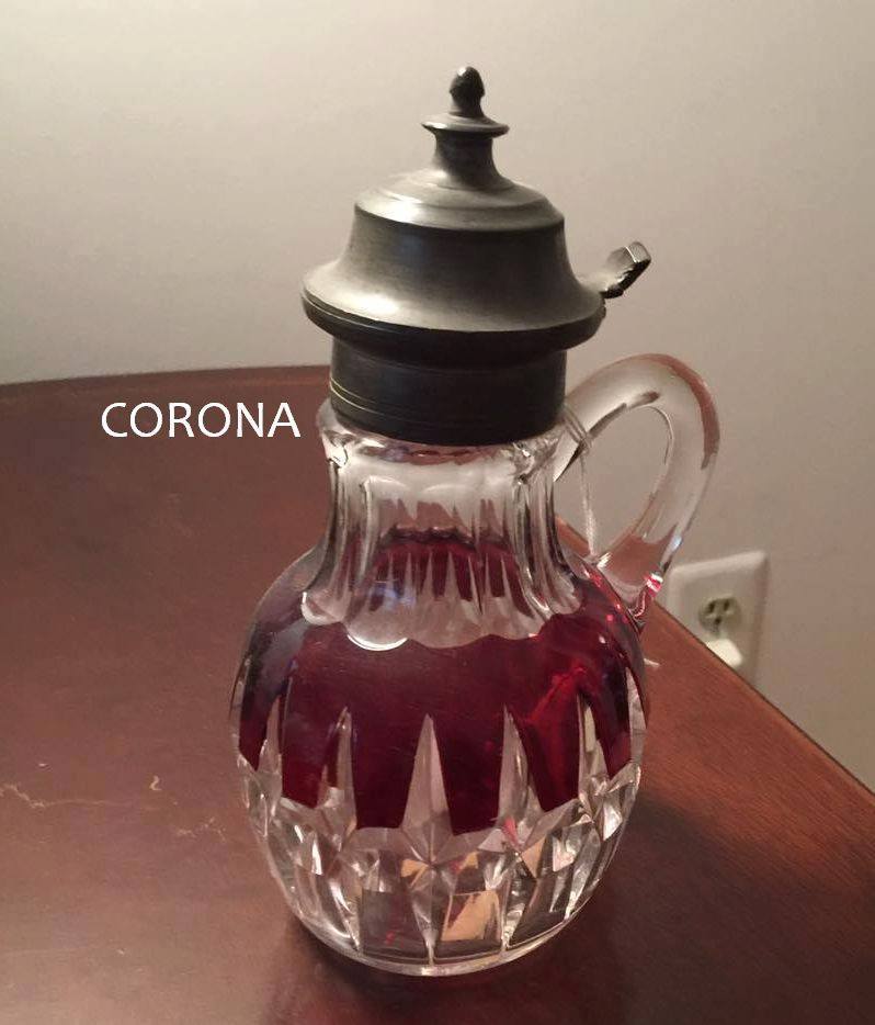 Contributor: Paul Kirk Jr- these are the only items of Corona that are shown in the c. 1901 National/McKee catalog. tankard pitchers in four sizes, individual cream, handled tumbler, and toothpick.