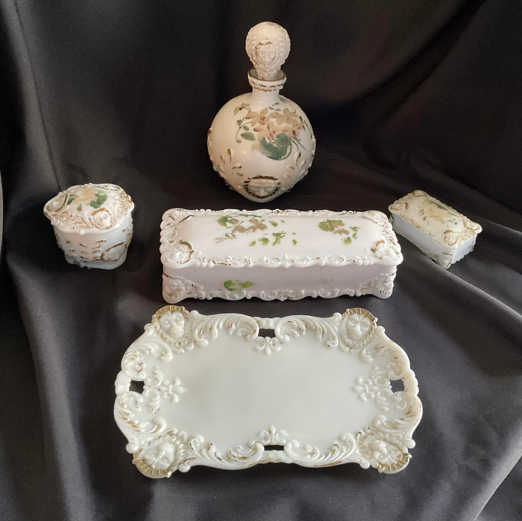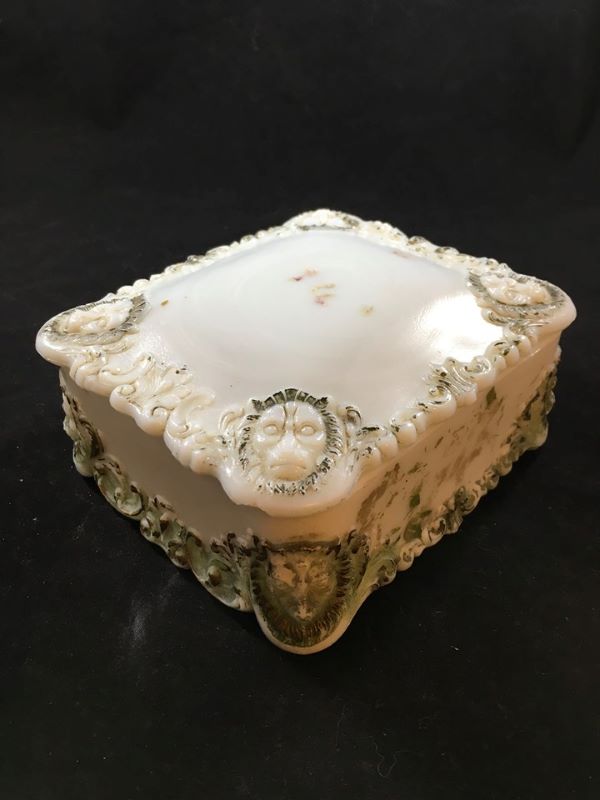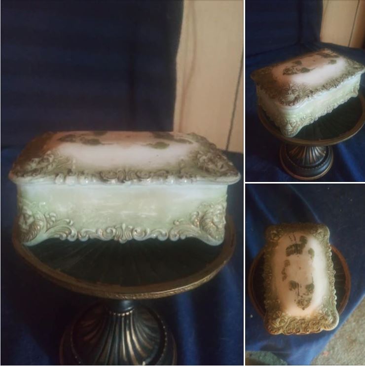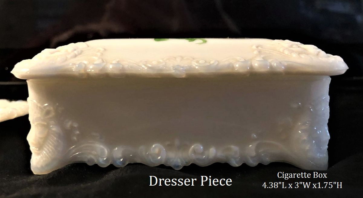 Contributor: Margaret Cote -cigarette box 4.38L x 3W x1.75H and ashtrays 5L x 2.75W x .58H