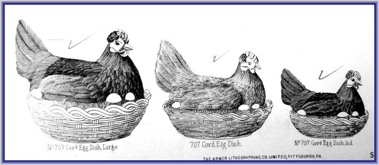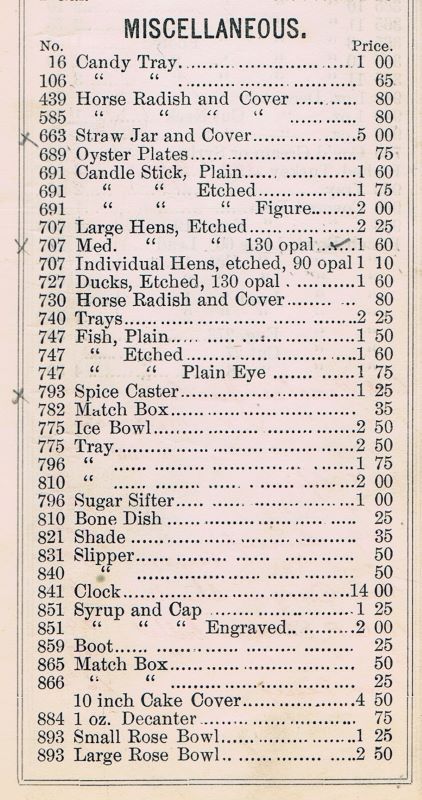 NOTE: Sid Lethbridge 2019: Central did make opal hens before joining US Glass as this 1891 price list shows. To get turquoise, all that is needed is a few ounces of copper in the batch so it is quite possible that Central made those as well.