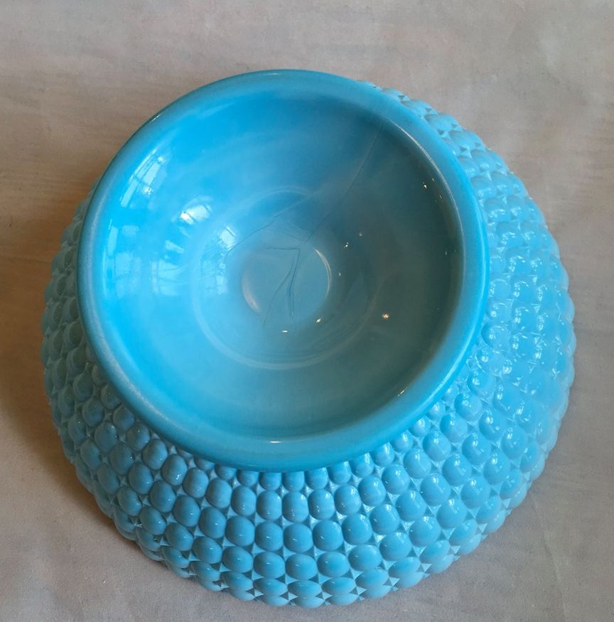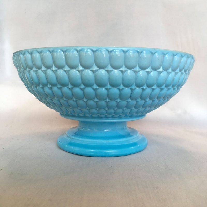 NOTE: The pattern has been called Thousand (1000) Eye (Belknap p 121) who suggested Richards & Hartley but this has raised ovals instead of the circles present on R&H No. 103 pieces. Has been found in both opaque blue and milk glass.