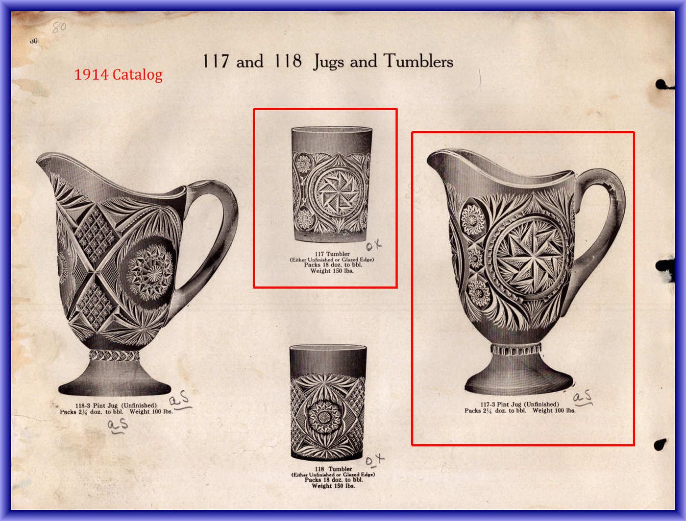 NOTE: Nos. 117 and 118 are reported by Craig Schenning as being introduced c1905. We do not have an advertisement or trade quote that specifically mentions these pitcher and tumbler sets. The pitchers appear as early as the Spring 1905 Butler Bros. wholesale catalogue.
