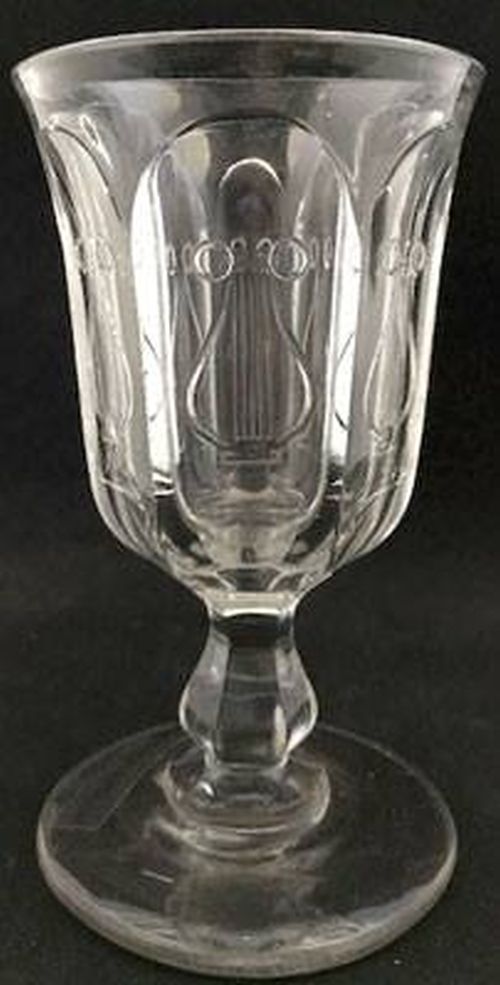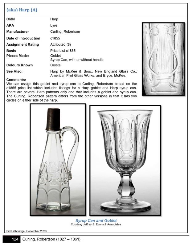 NOTE: Sid Lethbridge 2020: McKee catalogs show the spoon holder. So far, we don't know that Curling, Robertson made a spoon holder but other makers did. New England Glass and American Flint Glass Works both had Harp spoon holders in either invoices or sale listings. An 1854 catalog for Bryce, Richards shows a butter. The AKA for all is Lyre.