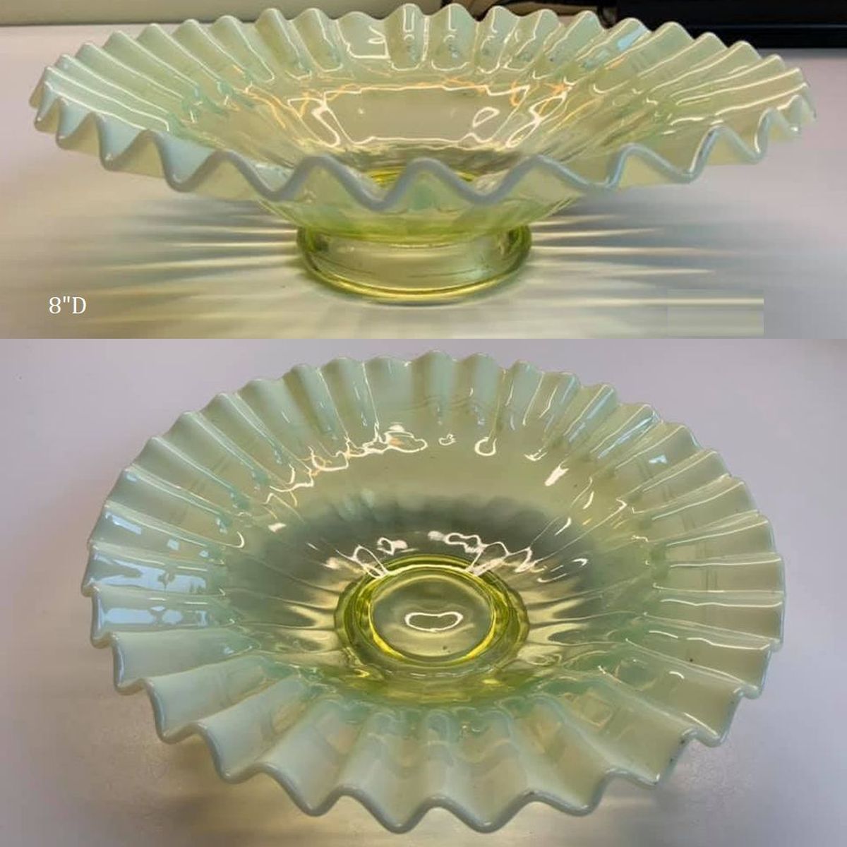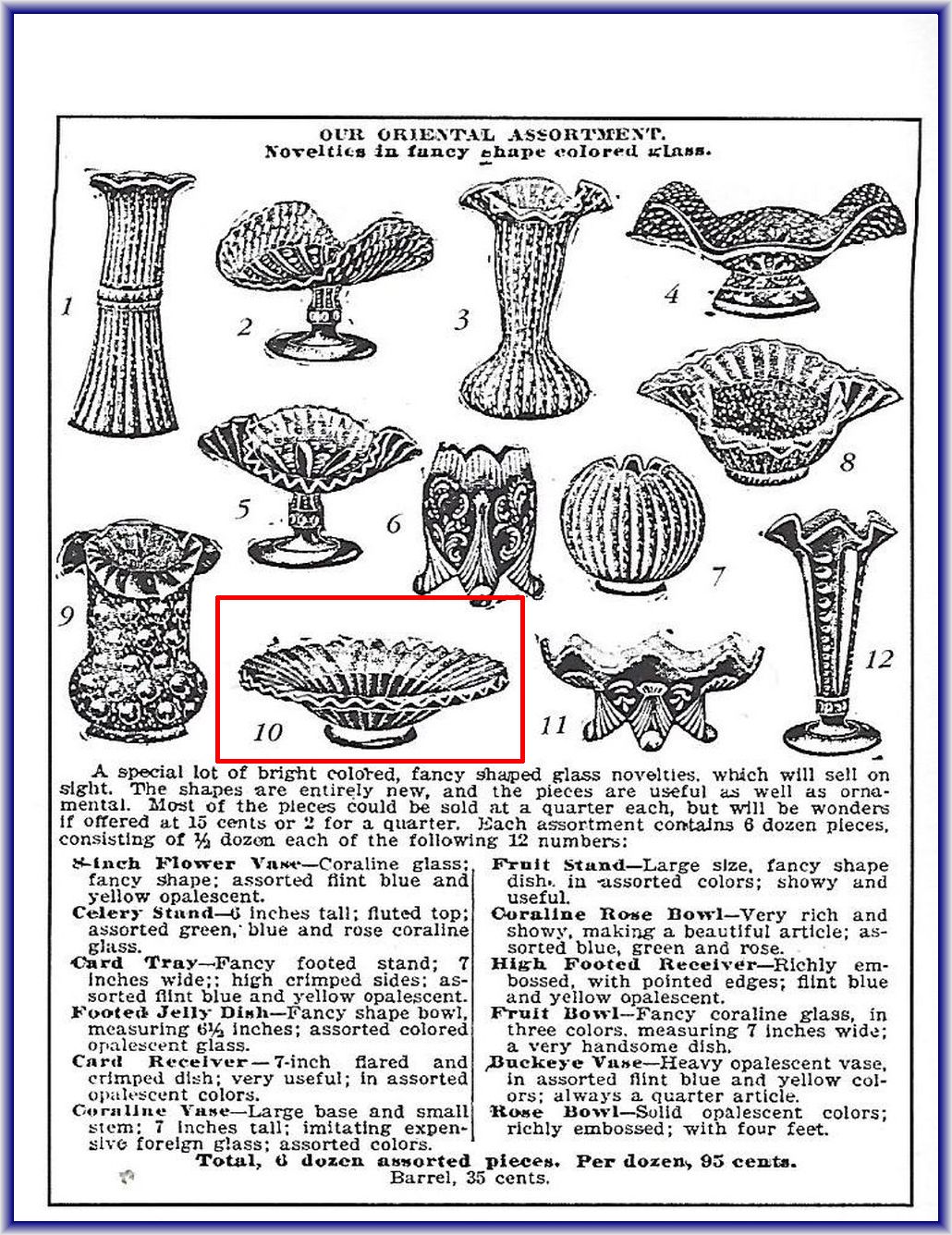 NOTE: Gene Serbus - This bowl appears to be one pictured (No. 10) in a G. Sommers and Co. catalog from 03-04-1901. It reads:"Card Receiver - 7", flared and crimped dish..." Reference: Dugan/Diamond by Heacock, Measell, & Wiggins. page 34