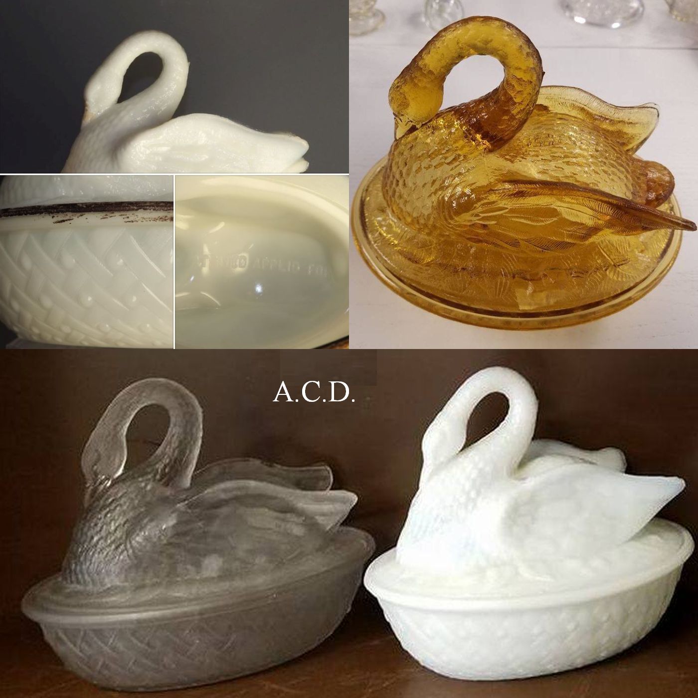 NOTE: Sid Lethbridge: There are two styles of bases - footed…and flat. Found in crystal, amber, blue, all the above frosted and opal (opaque white).