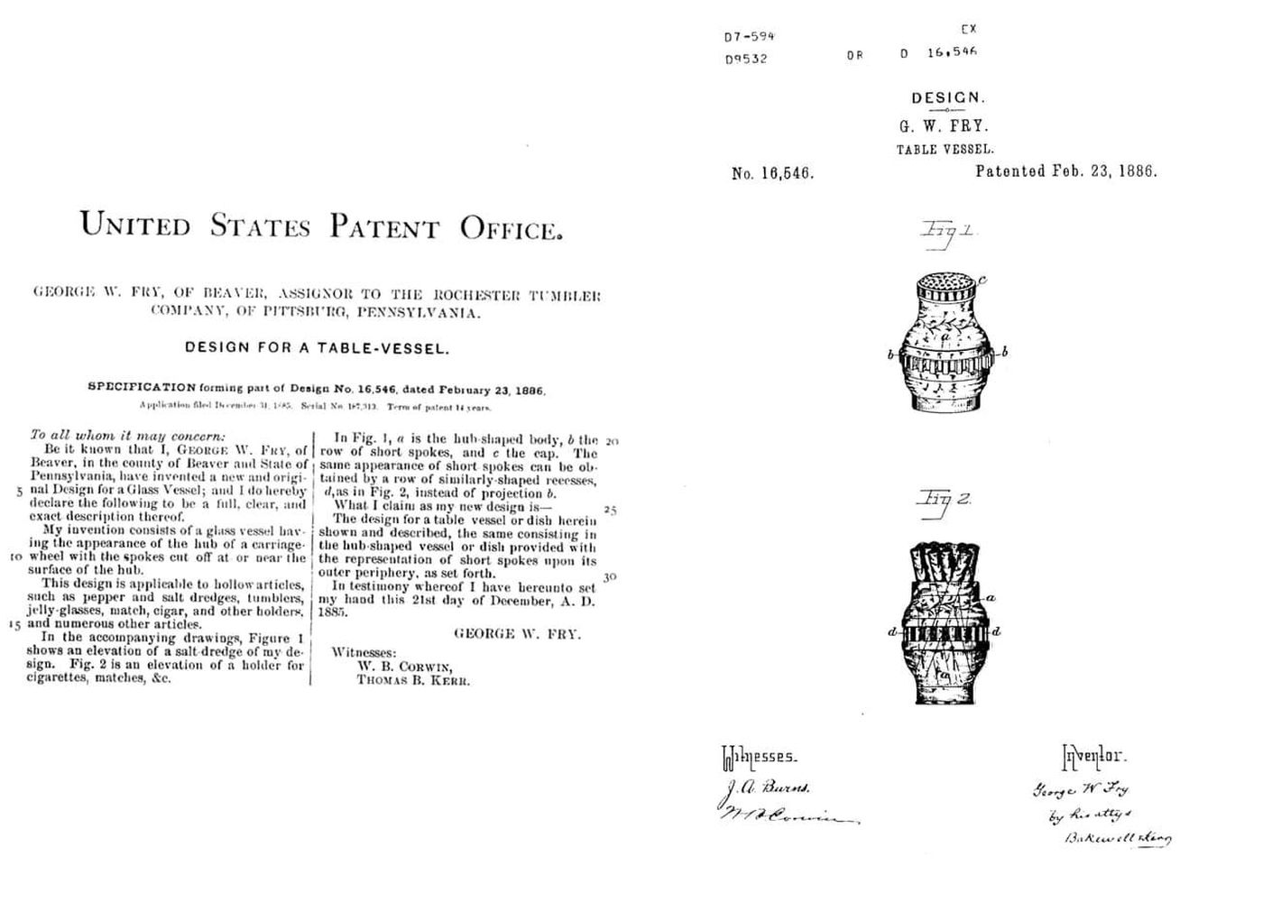 NOTE: Information provided by Richard Ryan. Patent application by George W. Fry, assigned to the Rochester Tumbler Company. (1886)