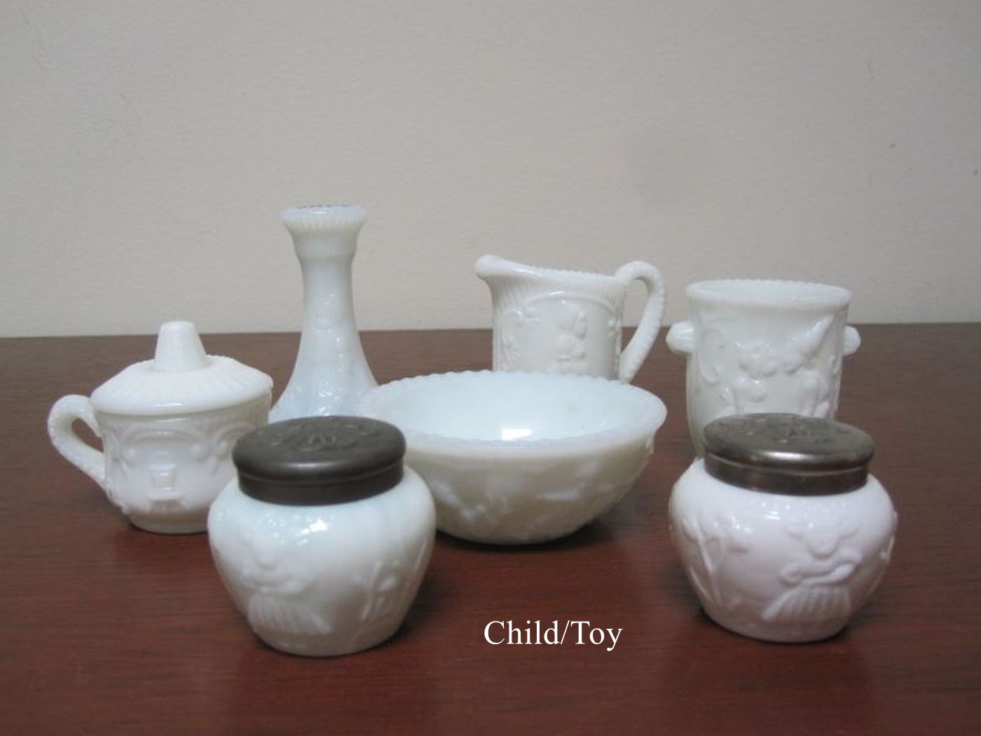 NOTE: An all TOY pattern. Linda Eppelheimer: attributed to USGC by Lechler, Children's Glass Dishes, China, and Furniture p60.. Found in blue opaque and white milk glass. Known pieces include: Pomade jar, Tray, "slop jar", candlestick (which may have been reproduced), Bowl, Pitcher, and a "potty".