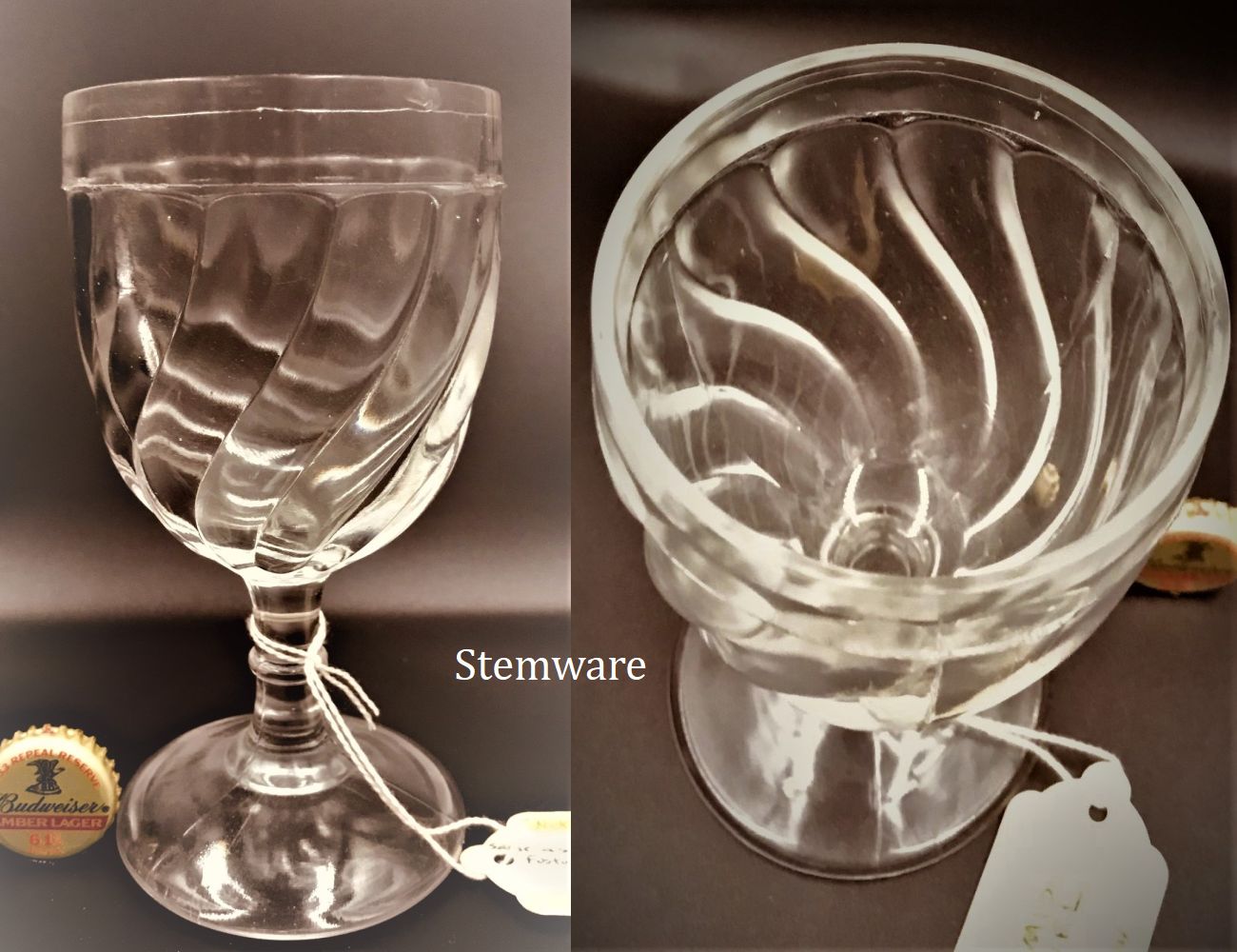 NOTE: The main thing distinguishing this goblet from the many other swirl patterns is the band (about 5/8") below the rim and the low quality glass. This apparently was a jelly/packers glass.