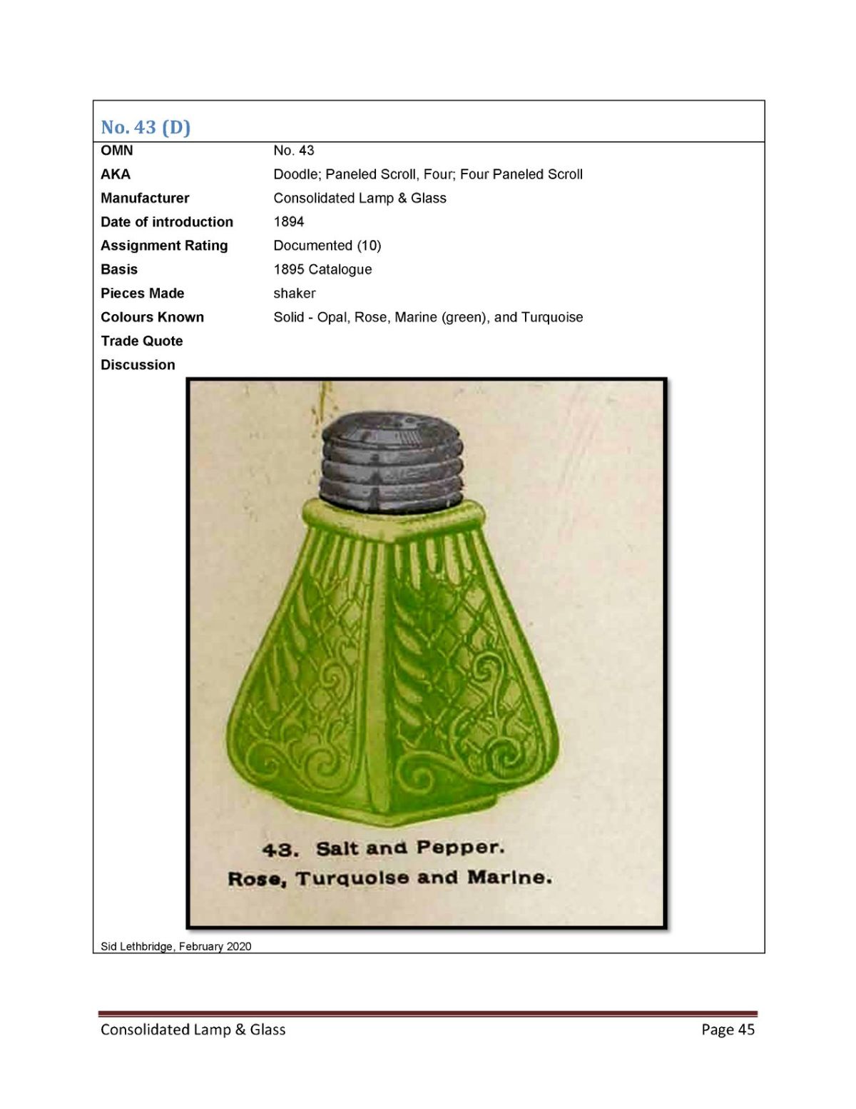 CONSOLIDATED LAMP & GLASS CO. No. 43 (OMN) by Consolidated Lamp & Glass Co/Fostoria-Ohio/Coraopolis-PA(Operated 1893-1964), 1894 Introduced