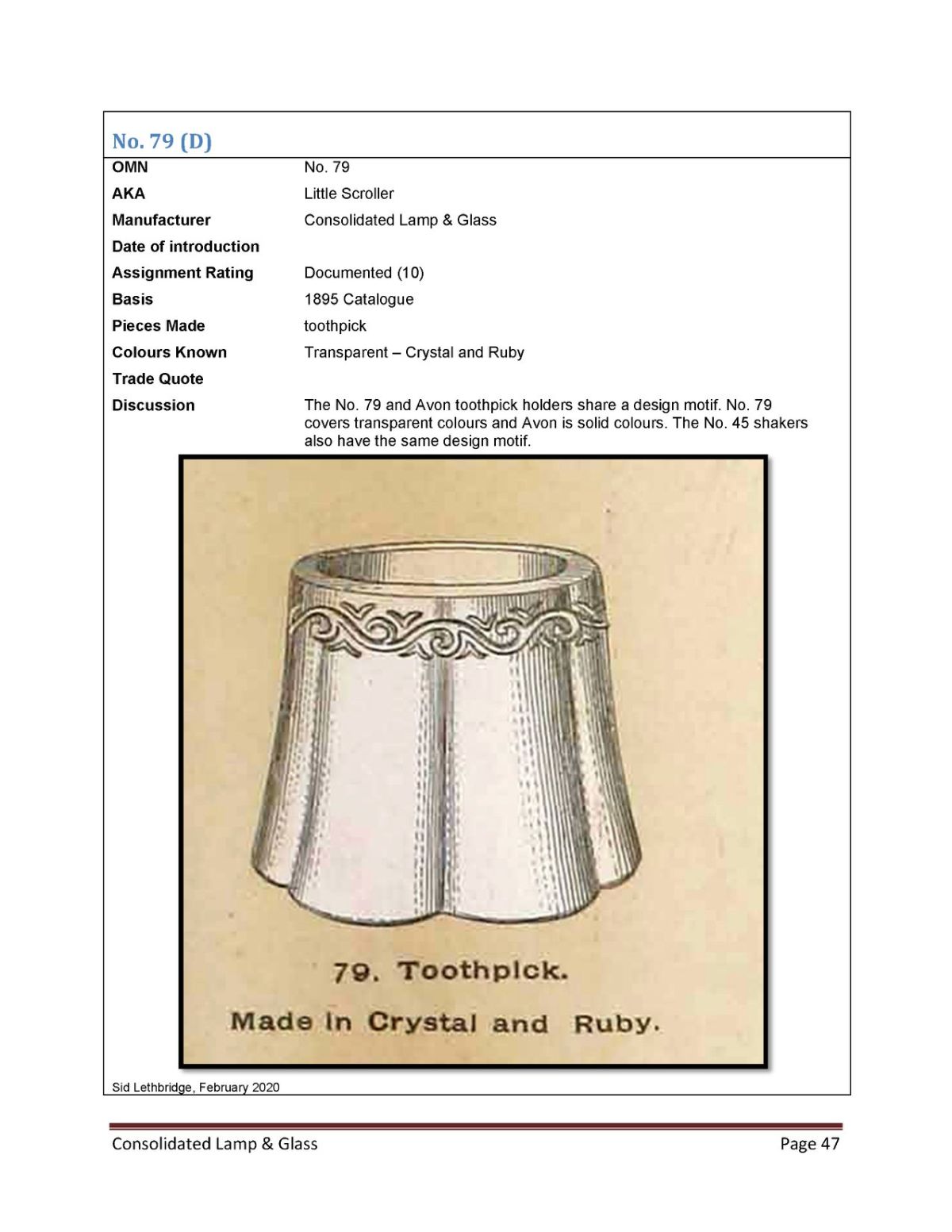 NOTE: The No. 79 and Avon toothpick holders share a design motif. No. 79 covers transparent colors and Avon solid colors. The No. 45 shakers also have the same design motif.