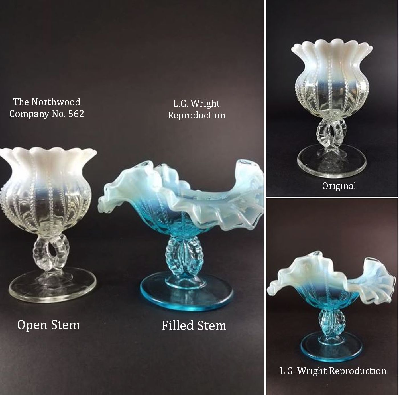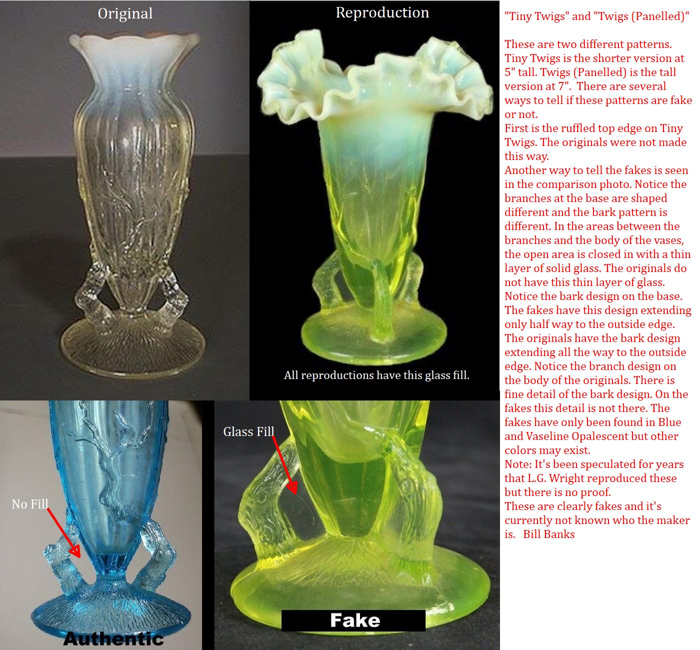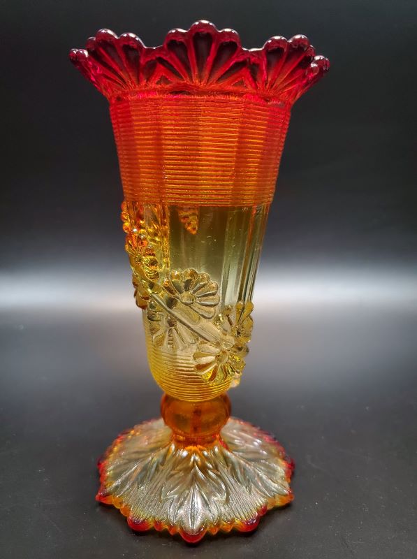 Contributor: Heather Norris - LG Wright Petticoat Vase, copy of Fluted Scrolls with Vine. Amberina, green, amber, blue. Northwood originals made in opalescent pearl blue, pearl yellow, and pearl flint.