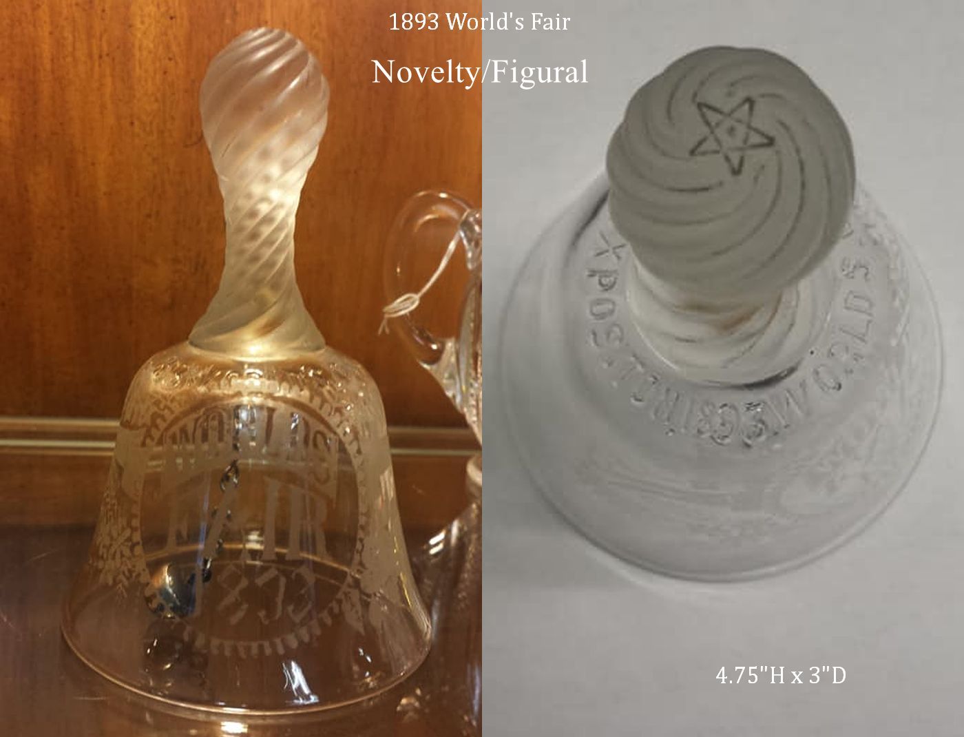 Contributor: Kathy Conn Turner 2-13-26 - Around the top, “World’s Columbian Exposition 1893” was moulded. The “N” at the end of Columbian is backwards. The clapper is silver plate.