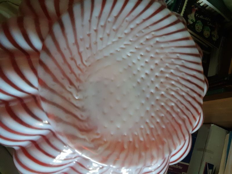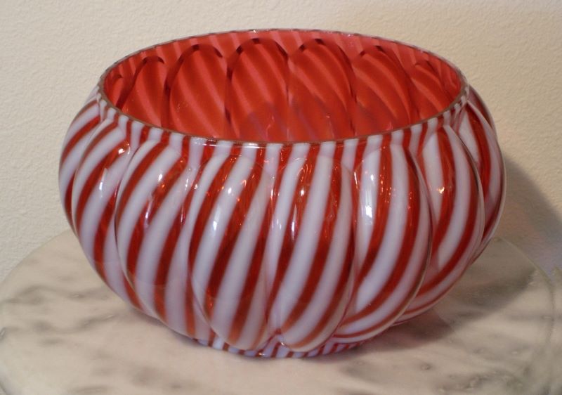 NOTE: Bill Banks 2020: ref Heacock Book 9, p68 (photo).The pattern is called "Melon Rib Swirl". Millers patent for the Swirl design in 1888 described the technique used... a rib spot mold and then twisted it. Shortly after the patent was received, spot molds were made to create the raised swirl design which eliminated the need to twist the pieces by hand. The bottom of this piece shows the indentations made by the metal plate that was used to anchor the ball of glass while it was twisted to get the swirl design. Then it was finished off by blowing into the melon shaped mold. Heacock believed this to be made by Northwood. Shown in book 9 pg 68. [..]the early plate marks on the bottom it would date to 1888 or earlier." known in blue, vaseline, cranberry
