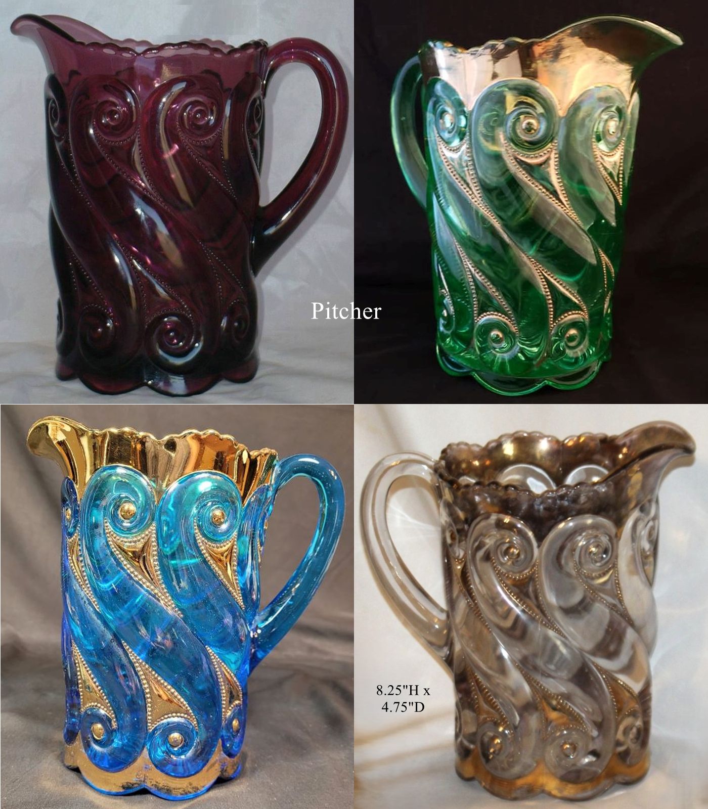 Contributor: Mary Prola 10-2025 - pitcher 8.25H, 7.5W handle to spout, 4.75D base. Tumblers 3.78H, 2.78W across top, 2.38D base