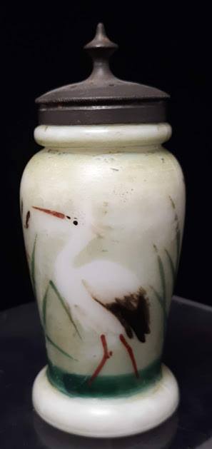 NOTE: ID by Lanae Kilcoyne. Lechner 2 page 32 discusses the Alden patent dated top with rotary agitator, made under contract by Mt Washington. Mold Blown, various decorations.