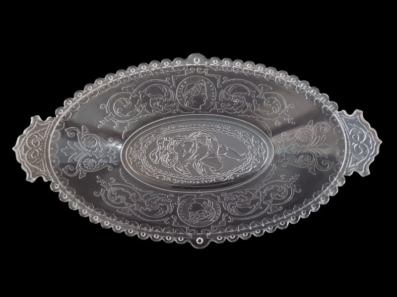 Contributor: Ginny Belcer 9 3/4"L x 5 1/4" W x 1 1/2"T. Rim detail is similar to some Dithridge pieces (Especially Boar Hunt)